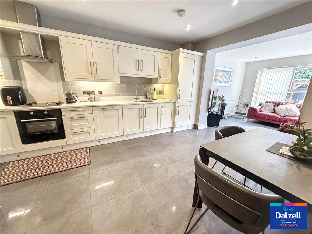 Range of high and low level cream solid shaker style units with complimenting quartz worktops and upstands. One and a half inset stainless steel sink units with mixer tap. Built-in electric oven and 4 ring gas stove with quartz splashback and stainless steel extractor over. Integrated fridge freezer. Integrated dishwasher. Integrated washing machine. Tiled between units. Tiled floor. Built-in storage under stairs. Recessed spotlights. Open plan to sun room.