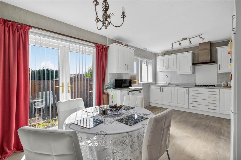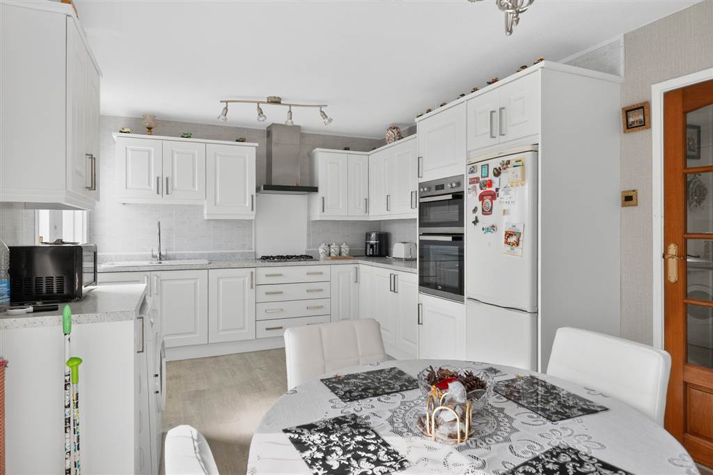Excellent range of high and low level units with white doors with underlighting. Large and small bowl single drainer sink unit with mixer tap. Plumbed for washing machine. Built-in double oven, 4 ring ceramic hob and extractor fan over. Panelled walls. Laminate wooden floor. PVC double glazed patio doors and PVC double glazed rear door.