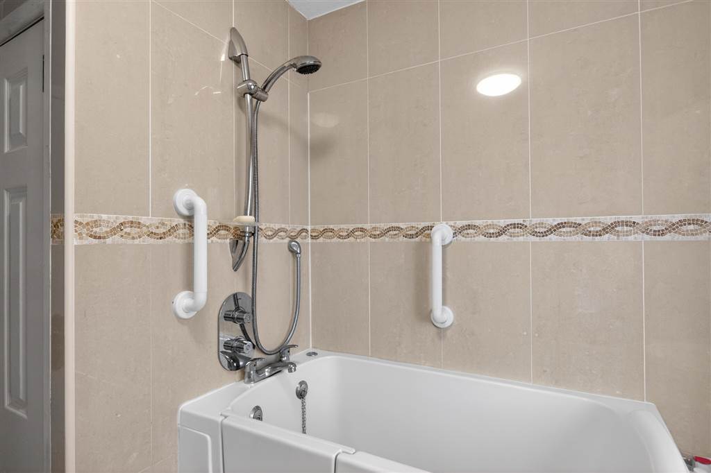 Fully tiled walls. Tiled floor. Modern white suite with combined shower bath, vanity wash hand basin with mixer tap and cupboards below. Low flush WC. Built-in hotpress.