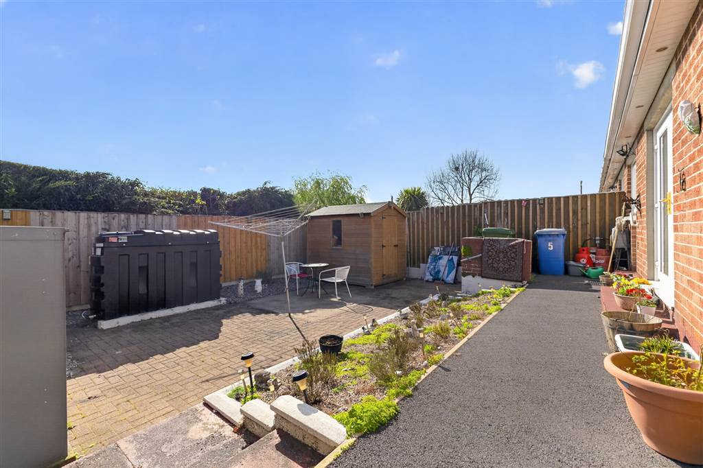 Tarmac driveway leading to detached brick garage. Garden to front in lawn bordered by shrubs/flowerbeds. Enclosed and private south facing rear garden in brick paving intermingled with shrubs. Timber fencing to boundaries.