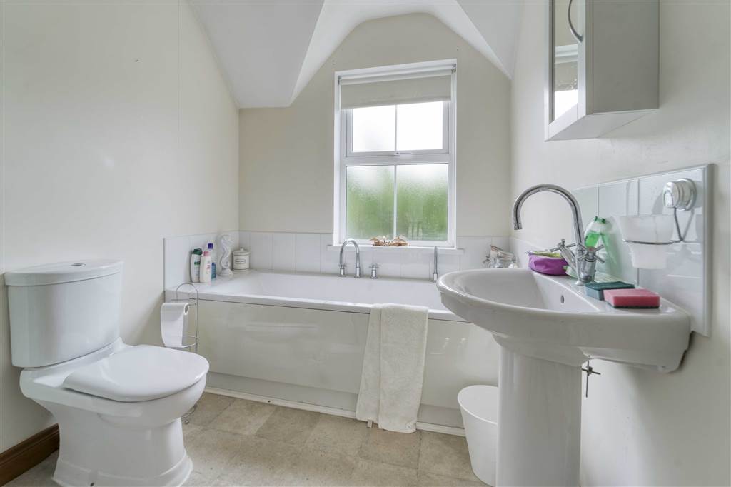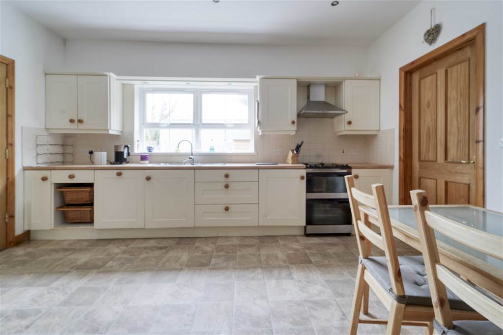 Good range of high and low level units in off white with wood effect worktop. Stainless steel sink unit with mixer tap. Space for oven. Stainless steel extractor unit over. Integrated dishwasher. Pullout bread baskets. Built-in larder with shelving. Ceiling downlighters. Tiling between units.
