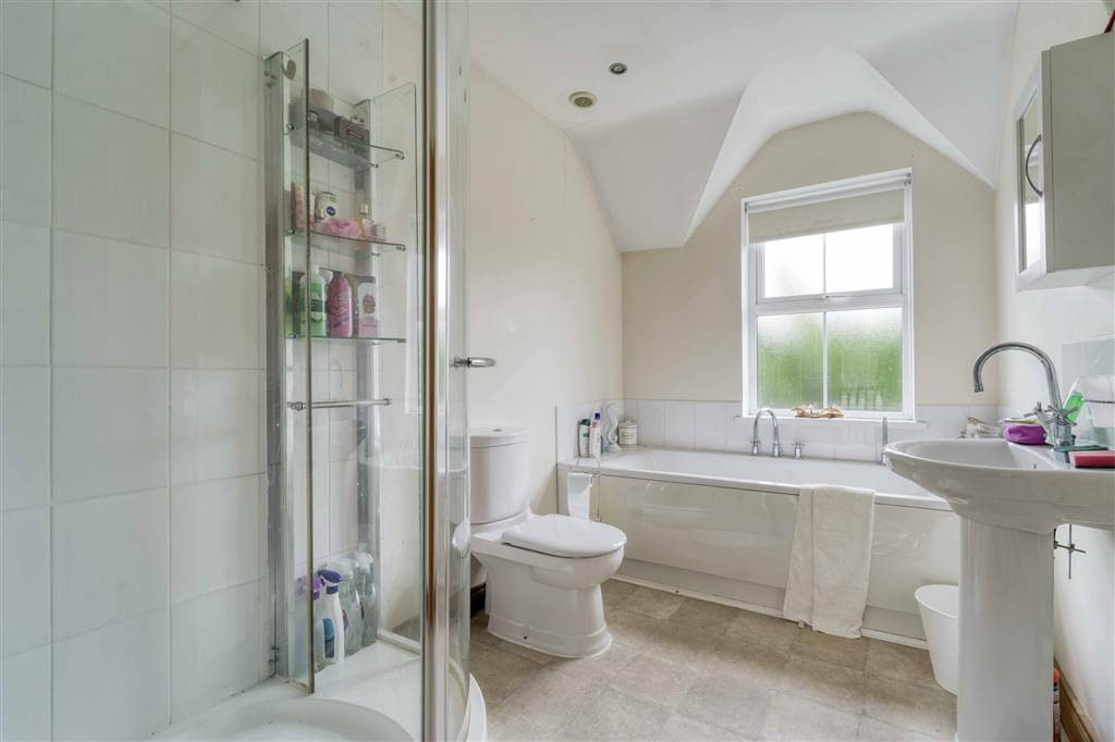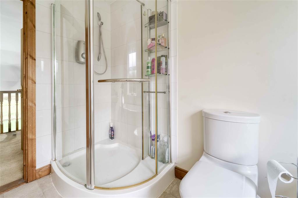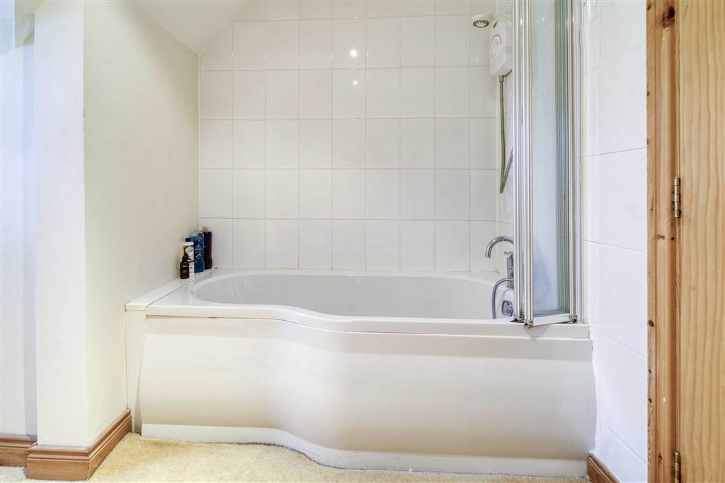 Shower bath with mixer tap and telephone shower attachment and electric shower. Shower door to side. Corner WC and corner wash hand basin with mixer tap and tiled splashback and fitted semi circular towel rail. Ceiling downlighting.