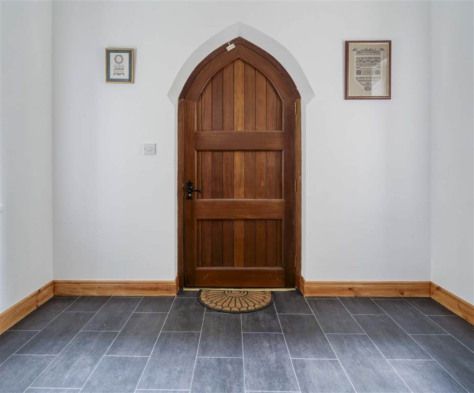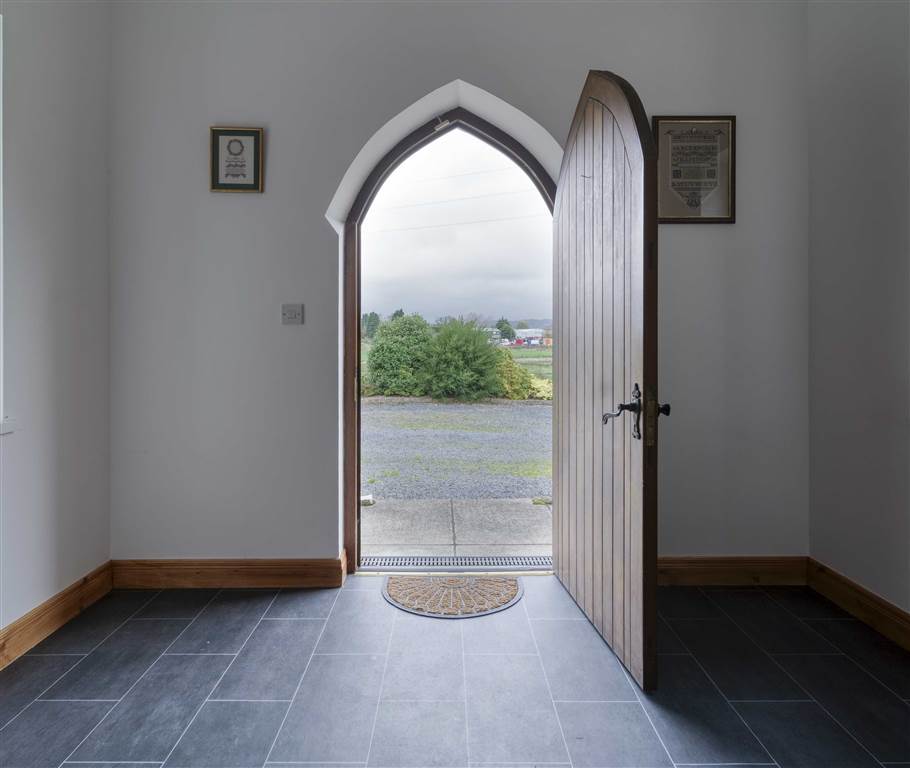 Arched hardwood panelled door. Tiled floor. Patio door.