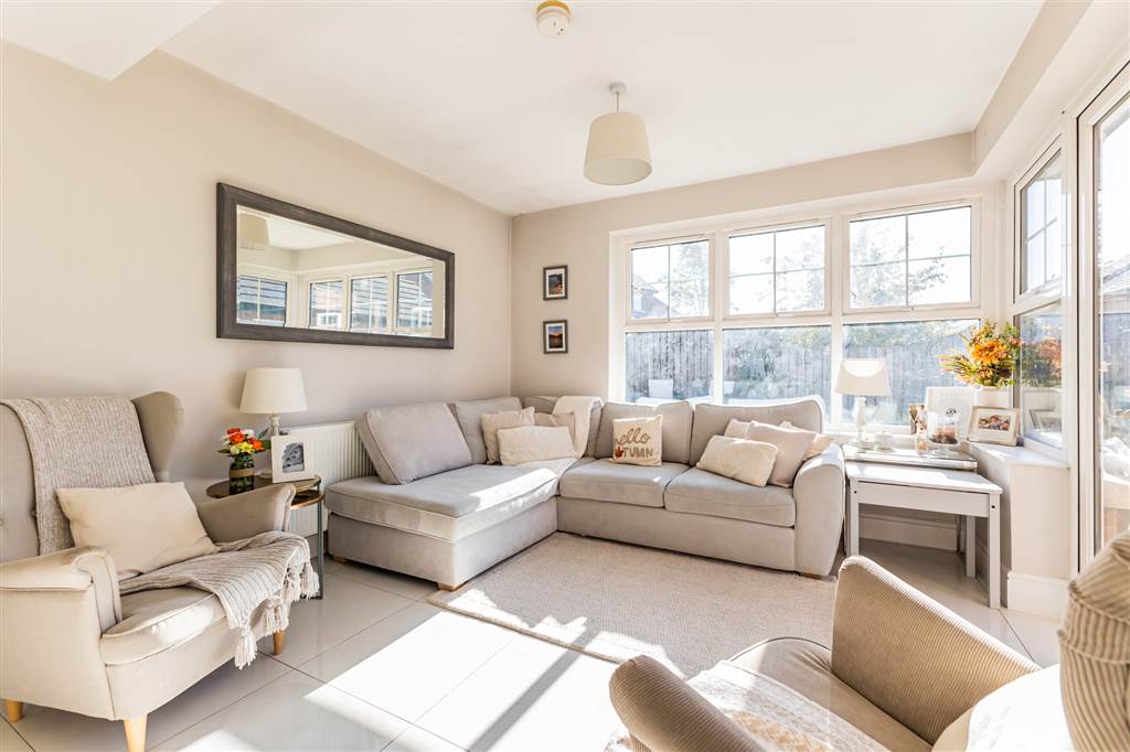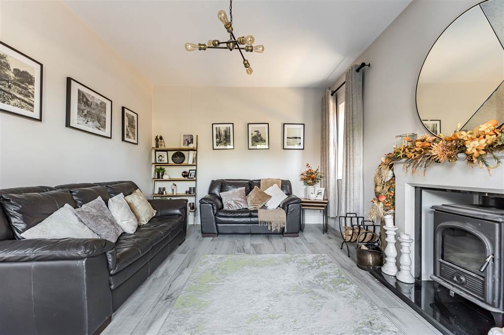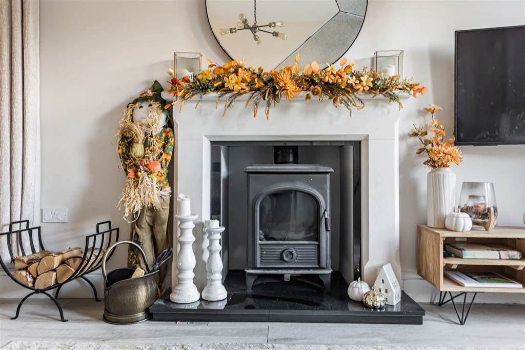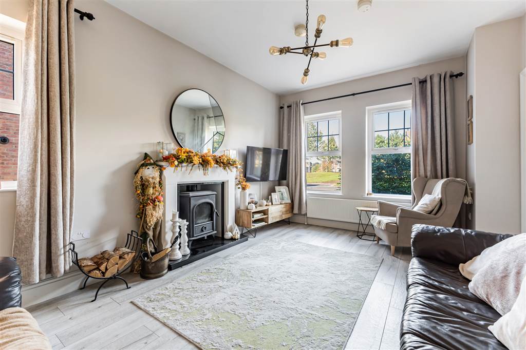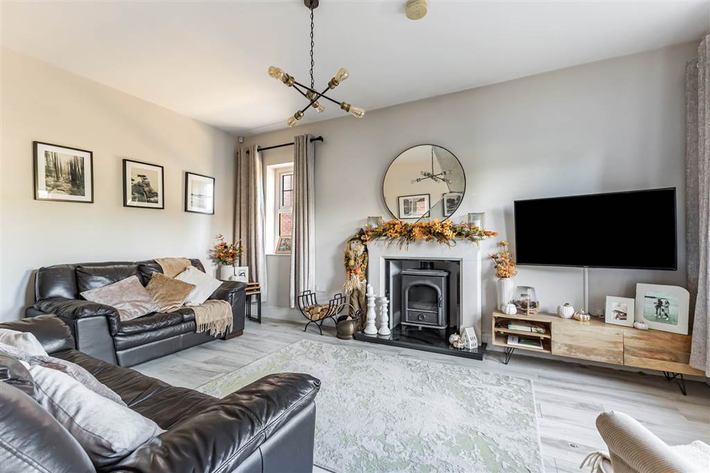 Tiled wood effect floor. Feature fireplace with limestone surround and inset cast iron stove. Marble hearth.