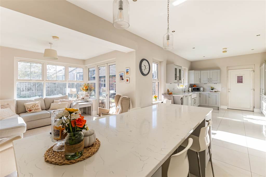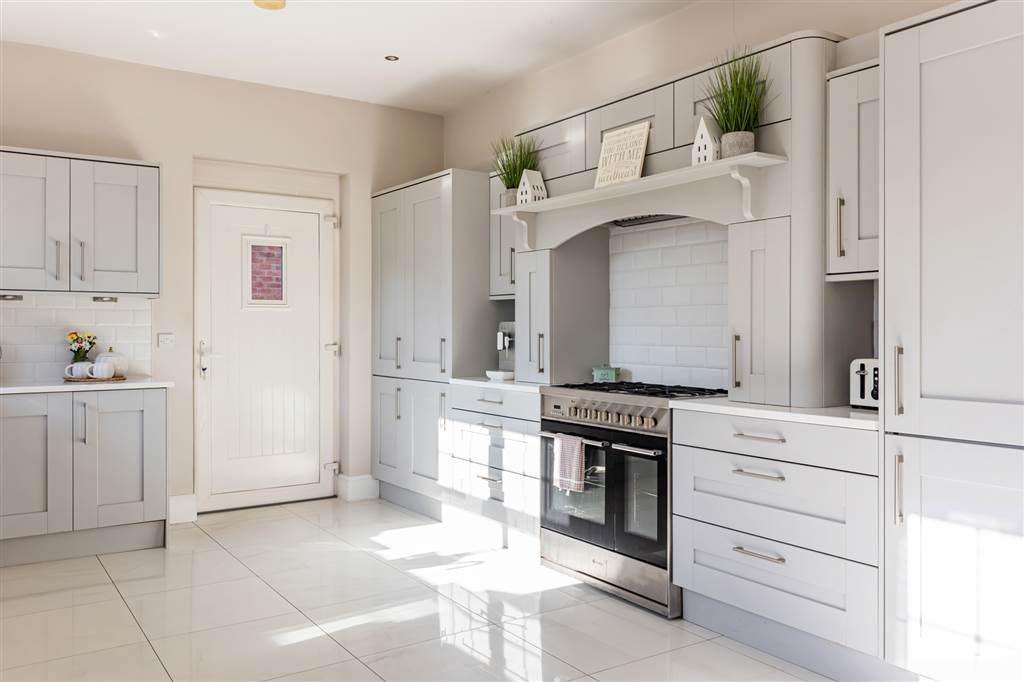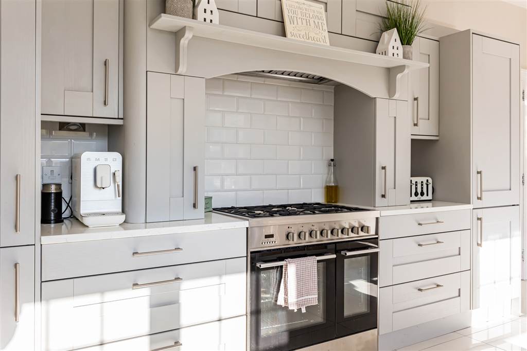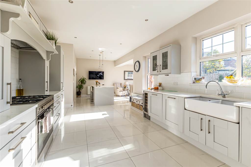 Exclusive range of high and low level units in grey with quartz worktop and matching island unit. Integrated floor to ceiling fridge/freezer. Neff dishwasher and wine fridge. 'Caple' five ring gas range cooker with oven under. 'Caple' twin Belfast sinks with mixer tap. Tiling between units. Lighting under high level cabinets. Ceiling downlighters. Open to: