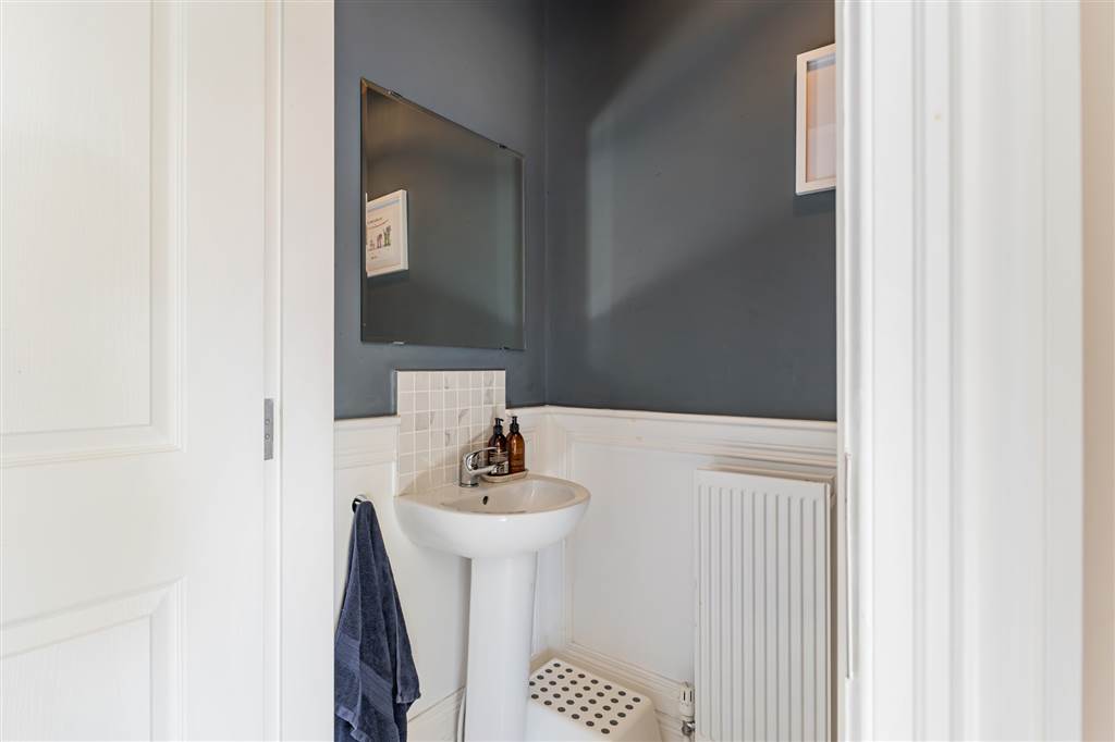 Pedestal wash hand basin with mixer tap and tiled splashback. WC. Part wood panelled walls. Tiled floor. Extractor.