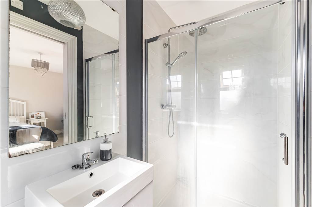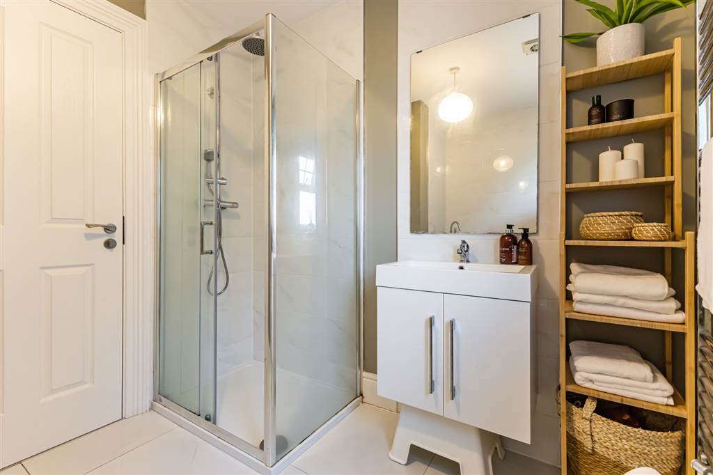 Vanity unit with mixer tap with tiled splashback with mirror over. Tiled shower cubicle with large rain shower head and flexible shower fitting. Chrome upright heated towel radiator. WC. Tiled floor. Extractor.