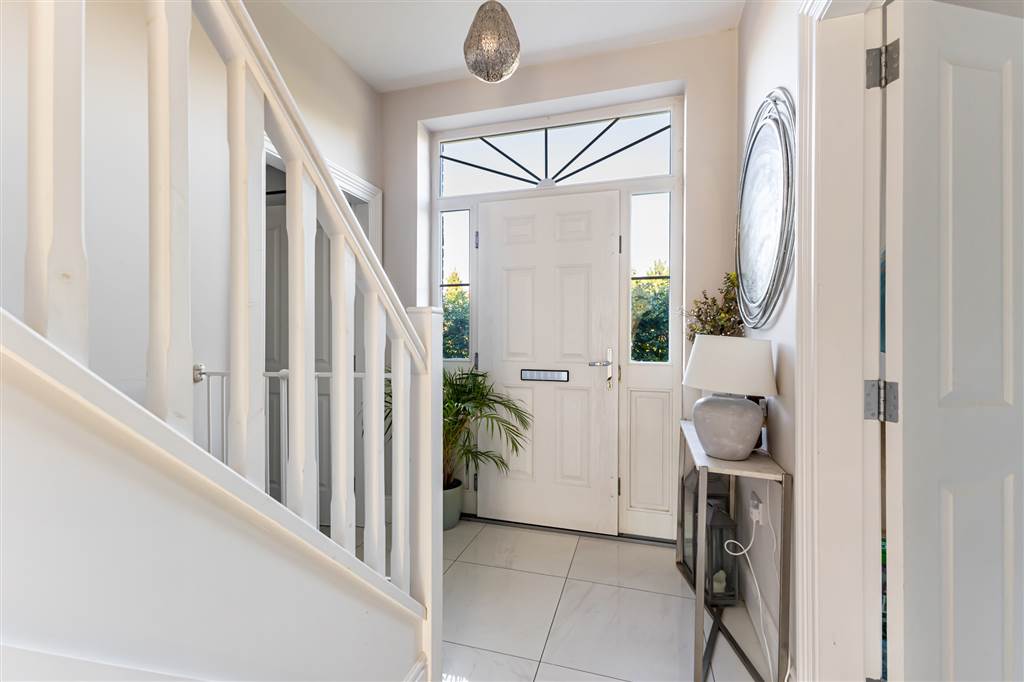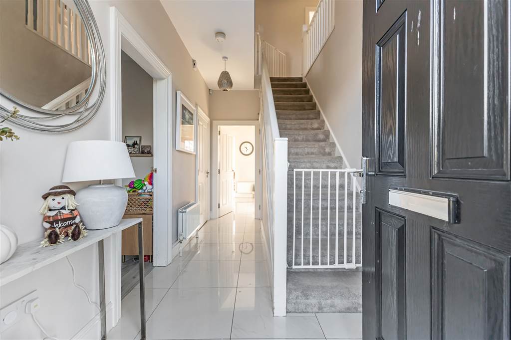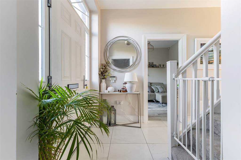 Four panelled composite front door with glazed twin side panels and fan light over. Ceramic tiled floor. Storage under stairs.