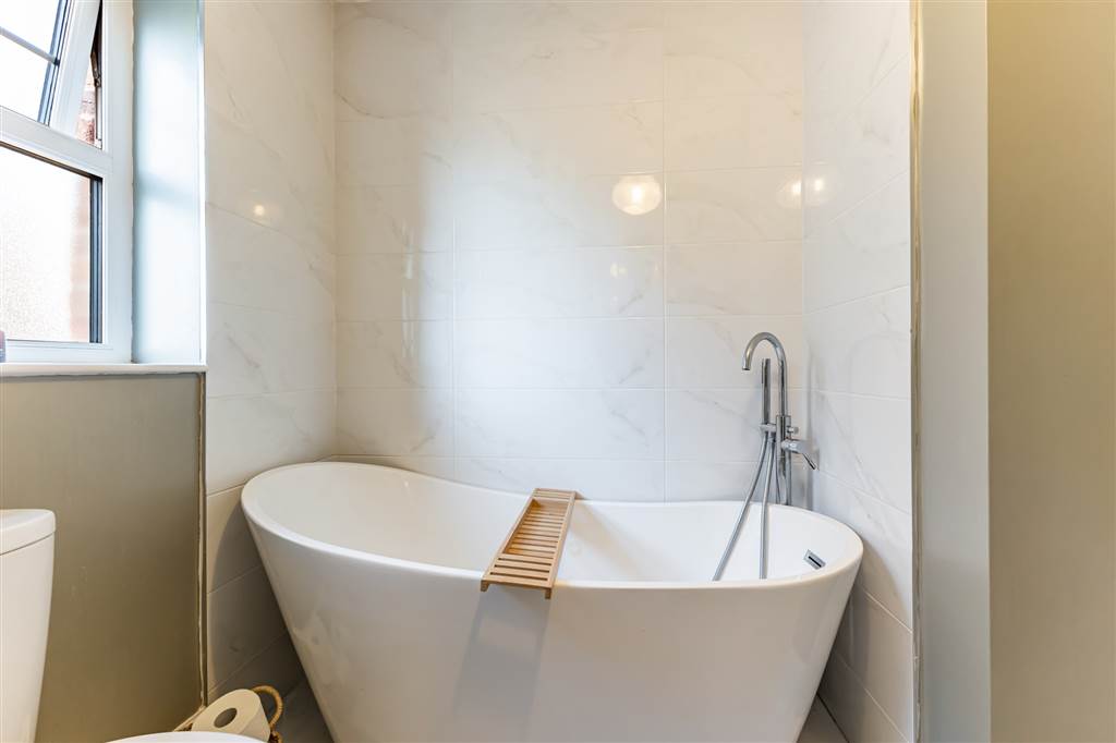Slipper style standalone bath with chrome mixer tap with flexible shower head.