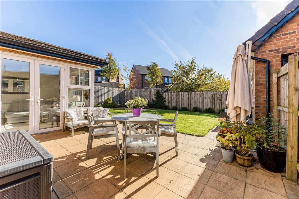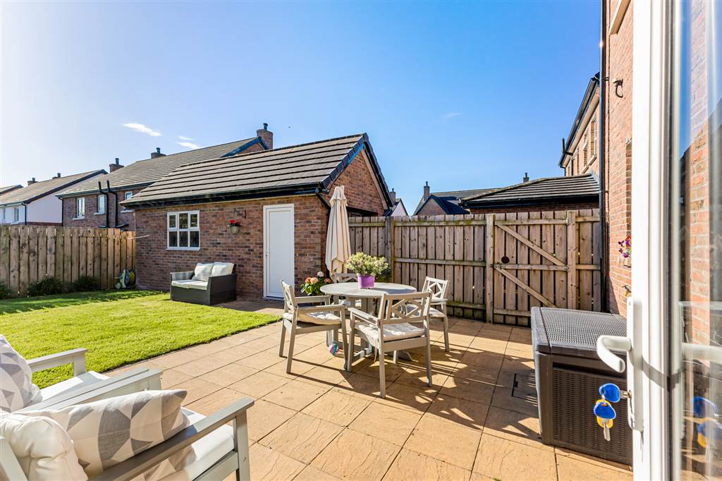 Tarmac drive with lighting and external power point leading to detached matching garage 19' 8" x 9' 10" (6m x 3m) with folding door and pedestrian side door with electric, light and power. Beech hedging to front providing privacy, tarmac parking area, lawn with paved path and outside lighting. Enclosed private rear garden with two patio areas in matching flag paving. Lawn. Timber fencing to boundary. Water tap and lighting. Side area.