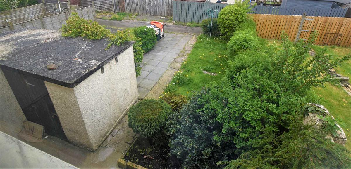 Rear Garden Laid In Lawn With Paved Patio Area / Outside Store