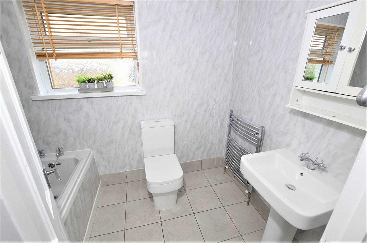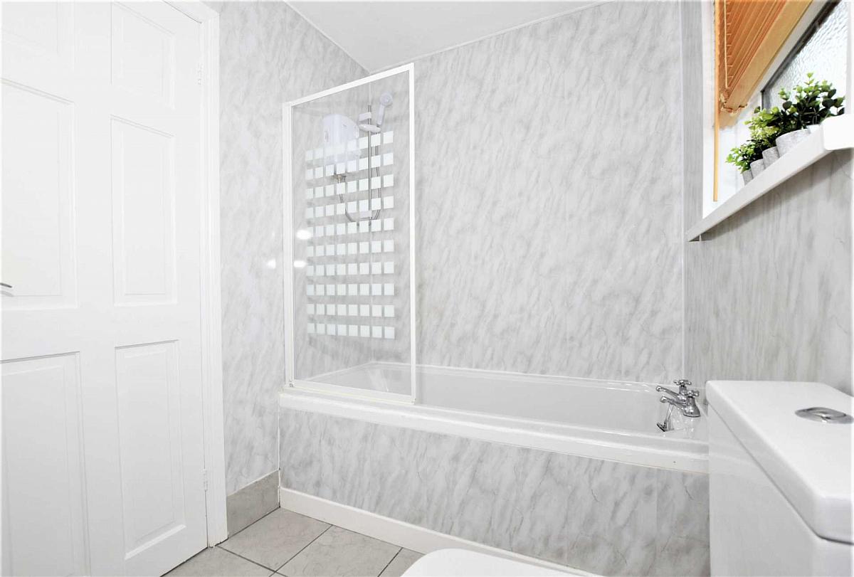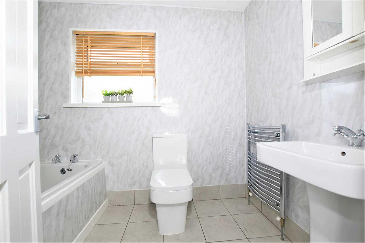 Bathroom With White Suite / Panelled Bath With Electric Shower / Chrome Heated Towel Rail