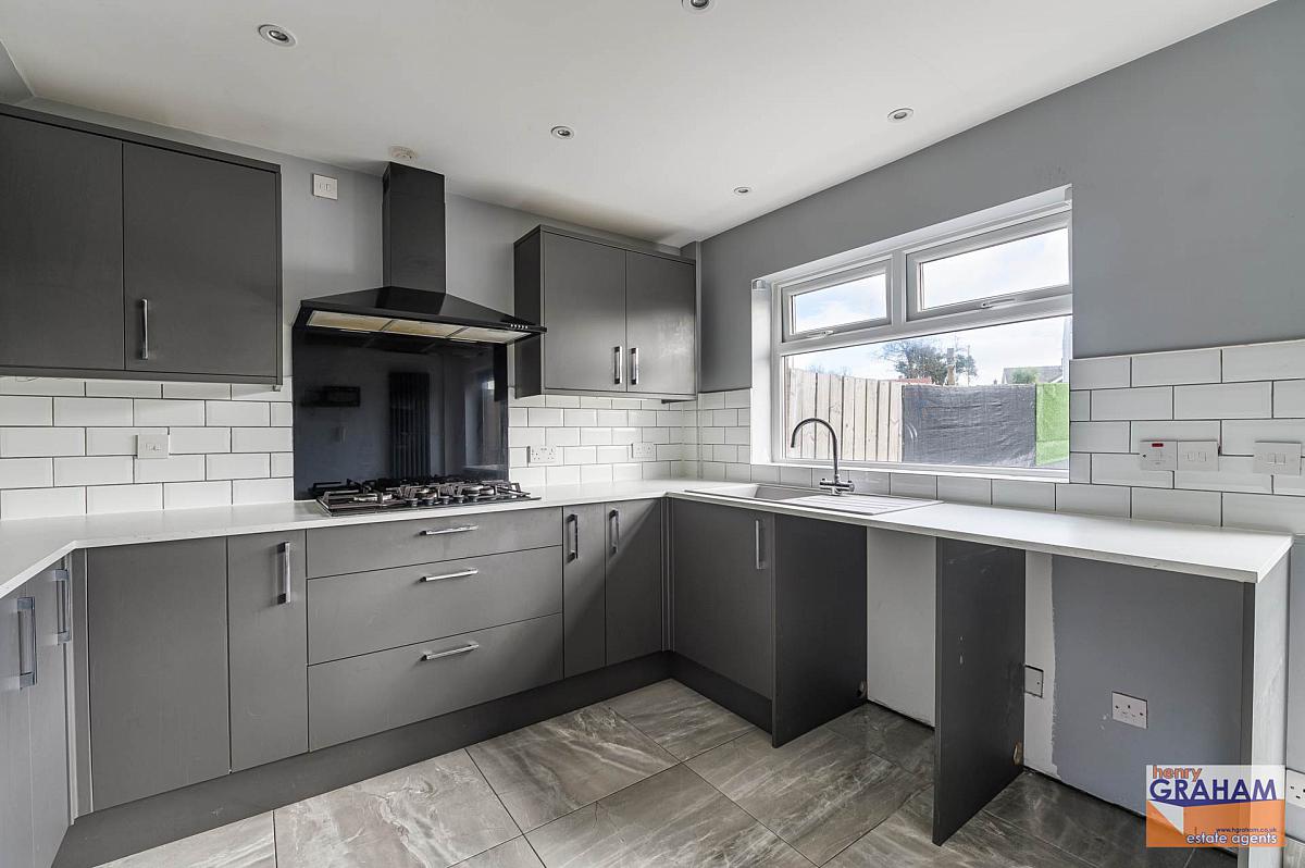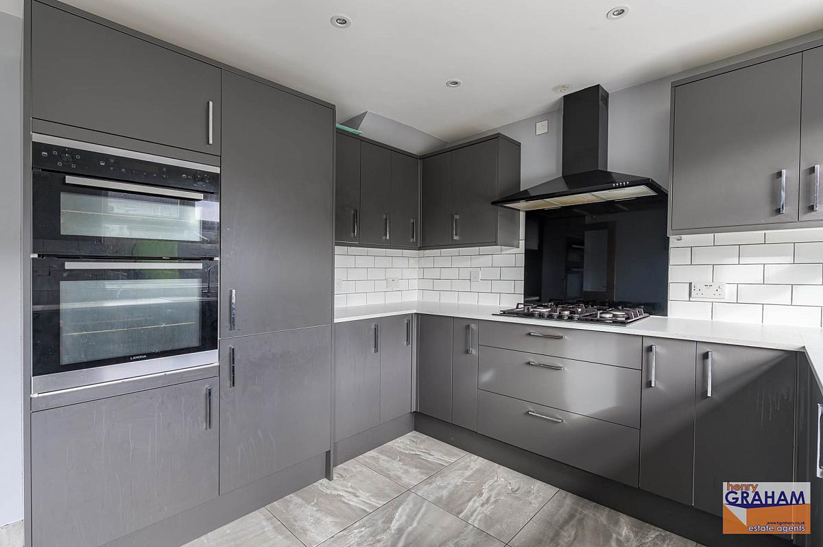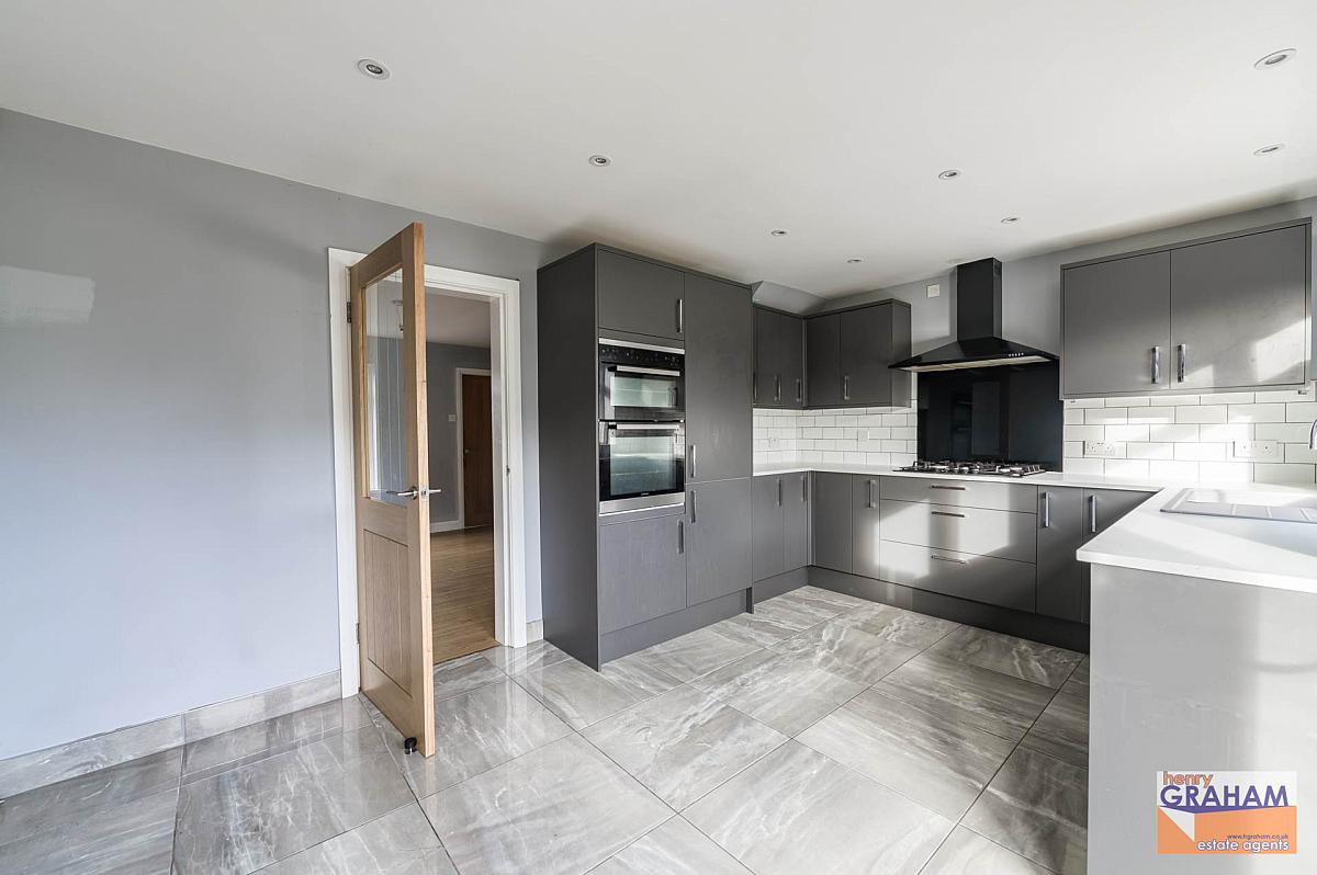 Range of high and low level units. Quartz effect work tops. Integrated double oven. Integrated five ring gas hob. Extractor unit in black stainless steel canopy. Single drainer composite sink unit with swan neck mixer tap. Plumbed for washing machine. Plumbed for dishwasher. Part tiled walls. Tiled floor. Recessed spotlights. Mahogany effect PVC double glazed double doors to rear decking area and garden.
