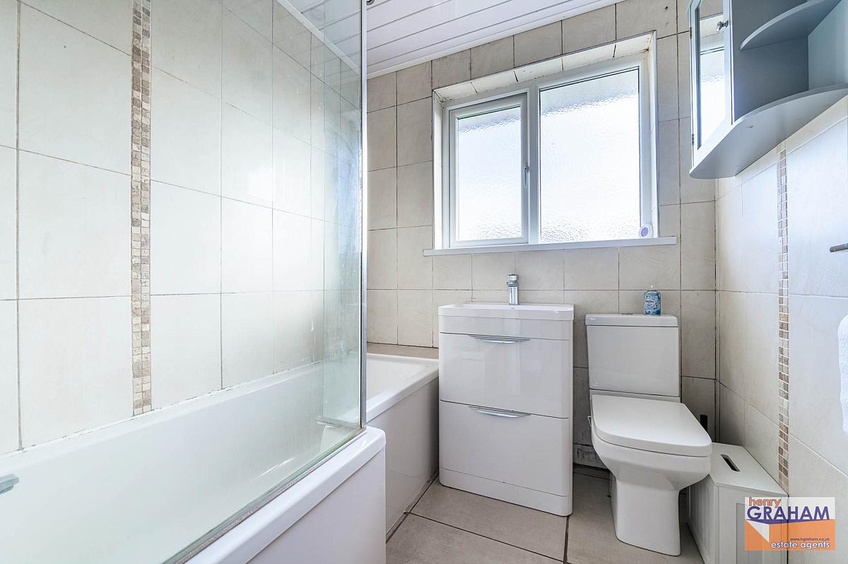 White suite. Panelled shower bath with mixer tap and Triton electric shower. Vanity unit with wash hand basin and mono style mixer tap. Close couple low flush wc. Tiled walls. Tiled floor. Recessed spotlights. Separate storage cupboard on landing.