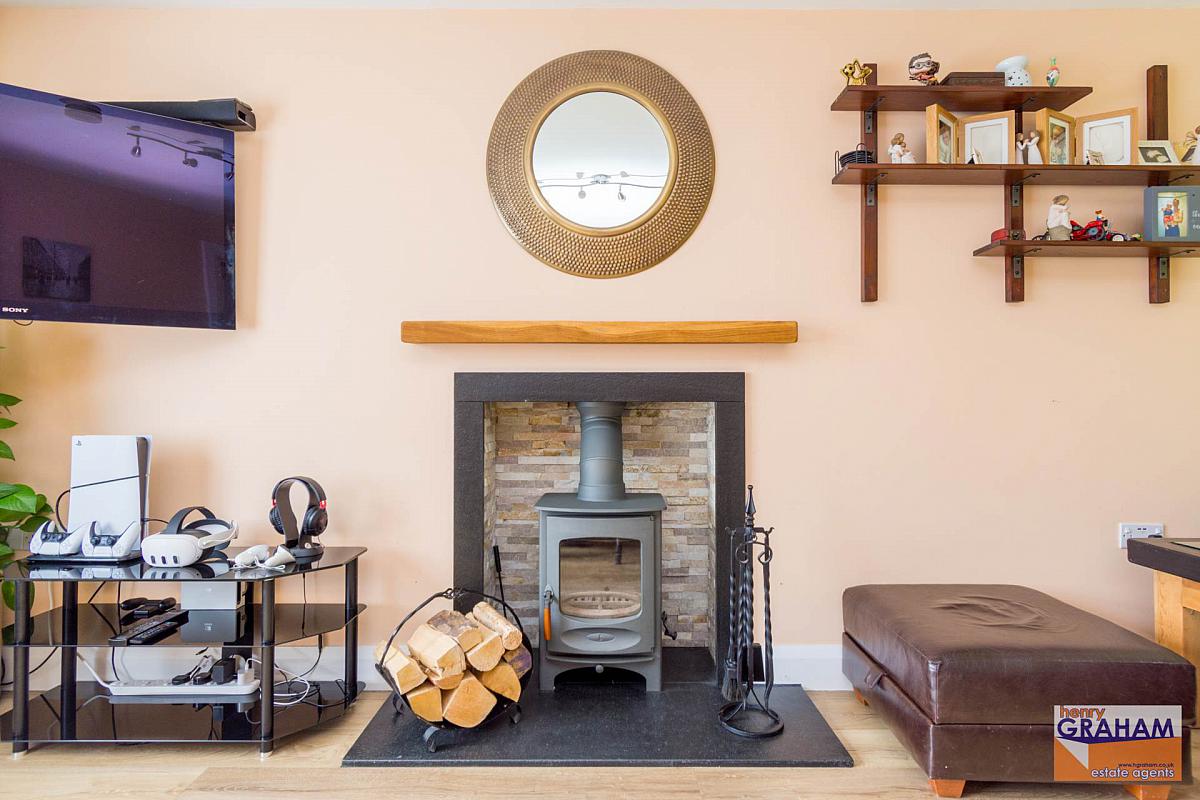 Multi fuel stove on slate hearth. Oak effect laminated timber floor.