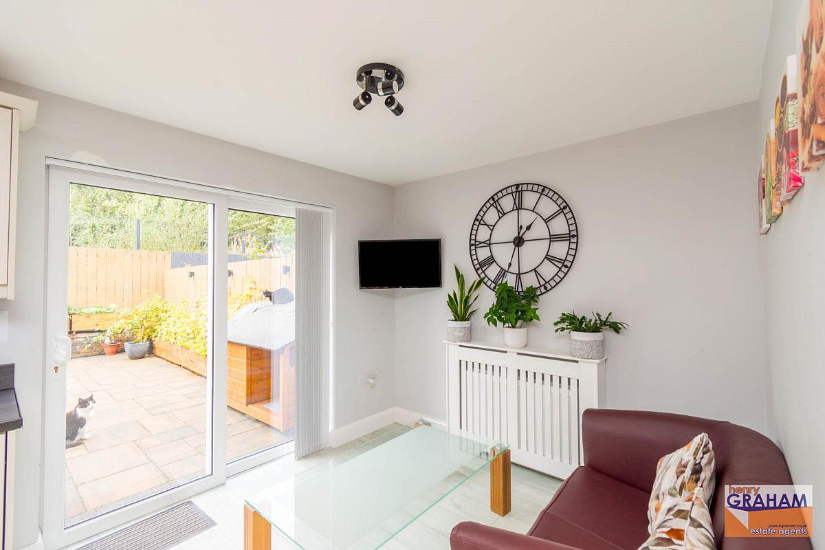 Measurement taken to widest points. Range of high and low level units. Oak effect worktops and upstands. Composite single drainer sink unit. Swan neck mixer tap. Integrated oven and 4 ring gas hob. Extractor hood in stainless steel and glass canopy. Integrated fridge freezer. Under unit lighting. Part tiled walls. Integrated dishwasher. Recessed spotlights. Open plan living area with double glazed sliding patio doors leading to rear garden.