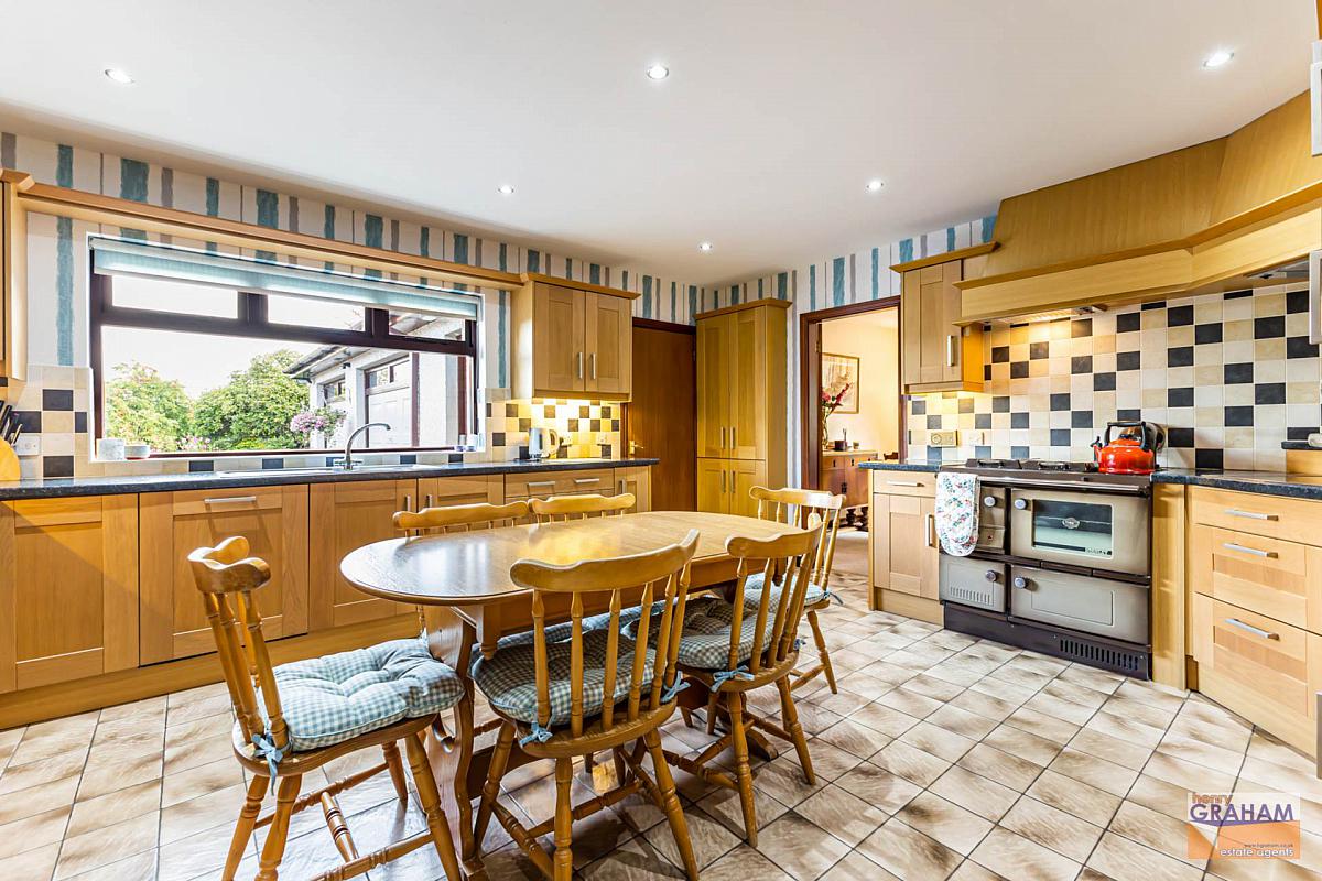 Range of high and low level units. Granite effect worktops. Bowl and a half single drainer stainless steel sink unit with mixer tap. Integrated fan assist oven. Integrated microwave. Integrated fridge. Integrated dishwasher. Ceramic hob. Stanley oil fired range/central heating boiler. Recessed spotlights. Part tiled walls. Tiled floor. Under unit lighting.