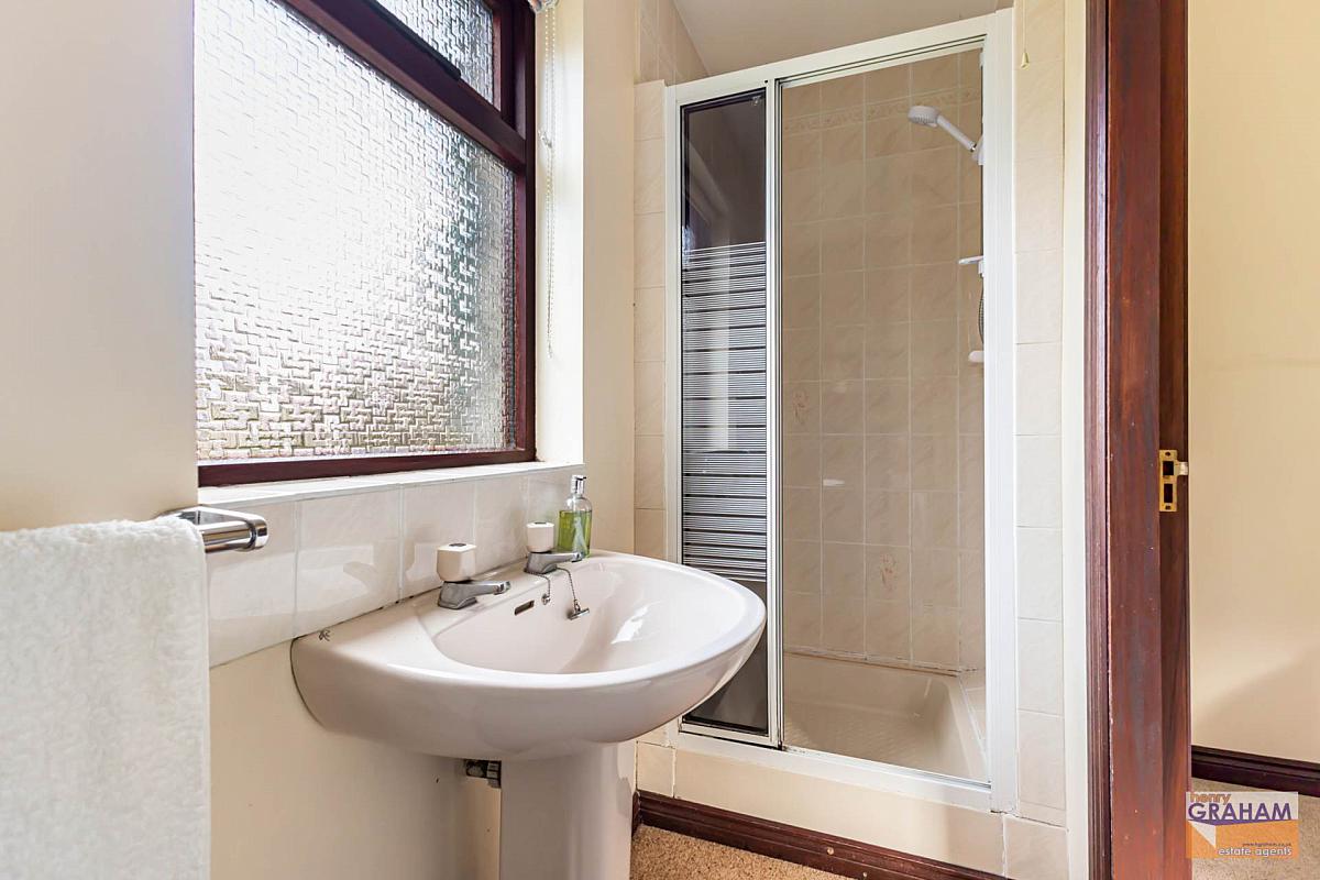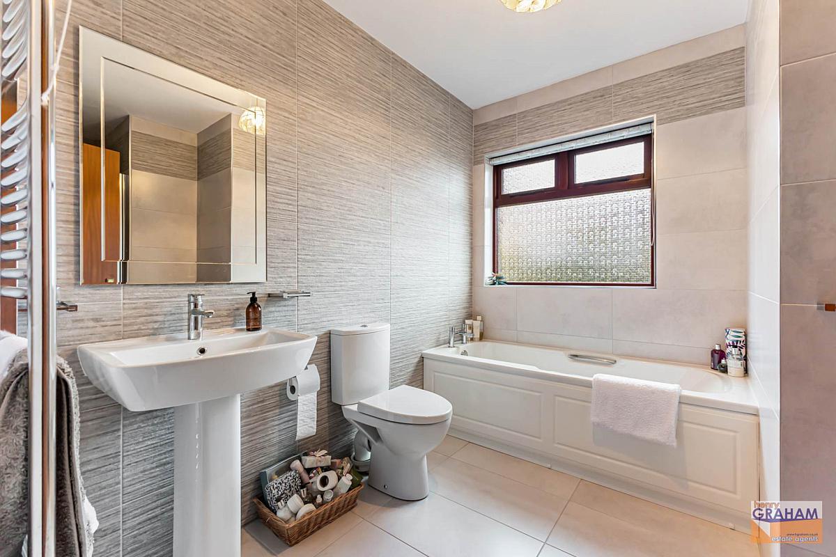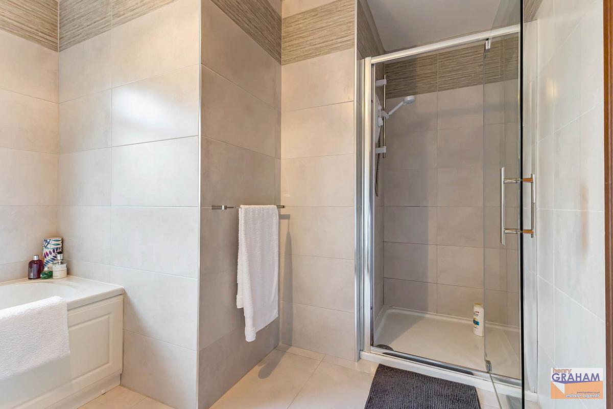 White suite. Panelled bath with mixer tap. Shower cubicle with Mira electric shower. Pedestal wash hand basin with mono style mixer tap. Close couple low flush wc. Chrome finish heated towel rail. Feature wall and floor tiles.