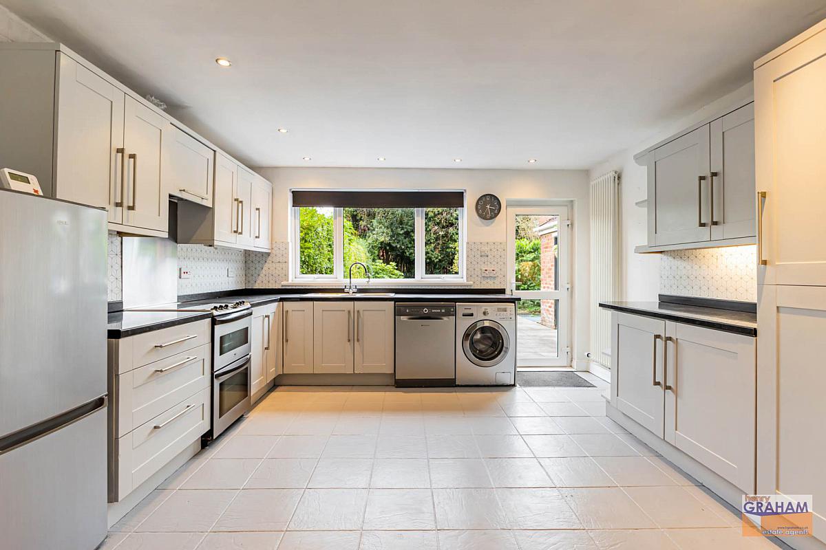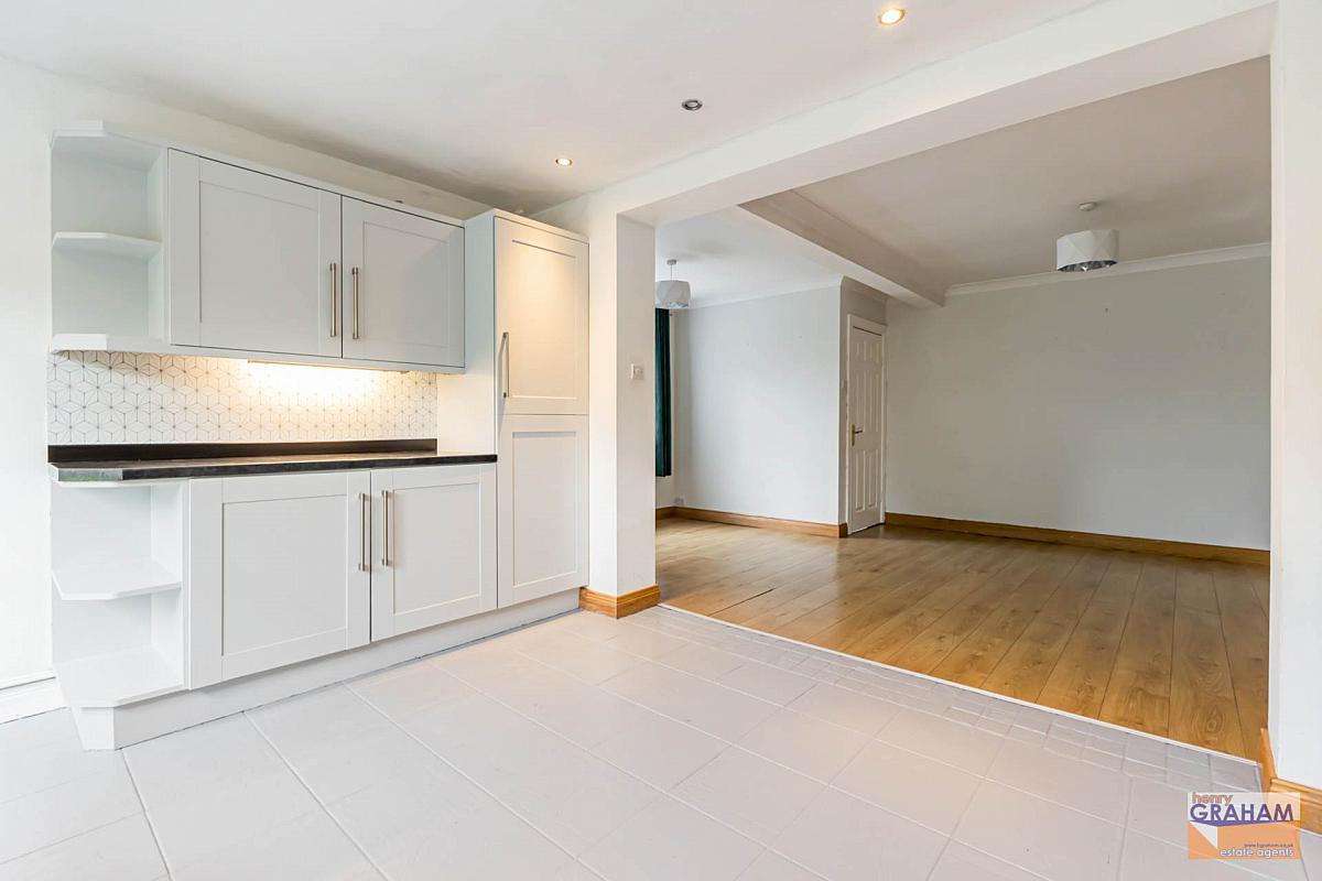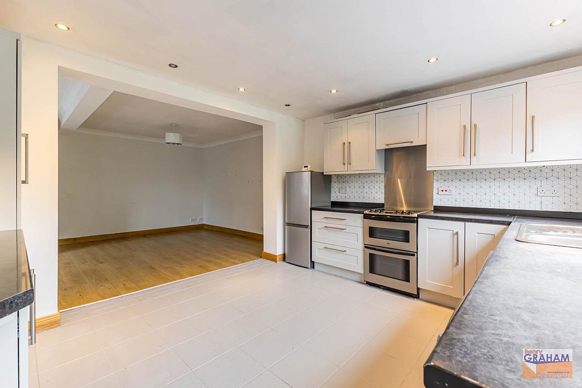 Range of high and low level units. Polished granite effect round edge work surfaces. Space for oven and hob. Concealed extractor unit. Bowl and a half single drainer stainless steel sink unit with swan neck mixer tap. Plumbed for washing machine. Plumbed for dishwasher. Part tiled walls. Tiled floor. Recessed spotlights. PVC double glazed door to rear patio area and garden. Open plan to living area.
