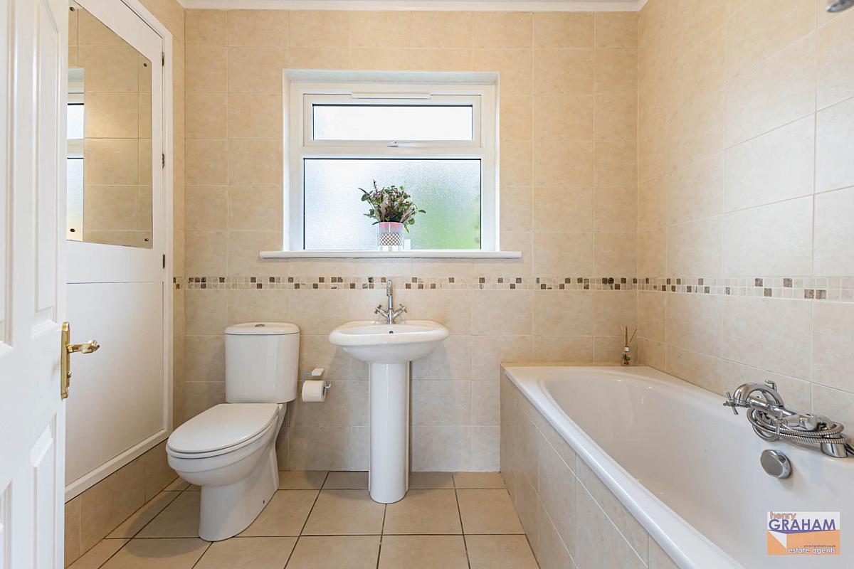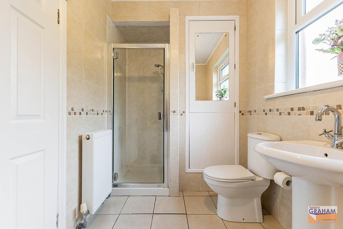 White suite. Panelled bath with centre mount mixer tap. Shower cubicle with Mira XL thermostatic shower. Pedestal wash hand basin with mixer tap. Close couple low flush wc. Tiled walls. Tiled floor. PVC panelled ceiling.