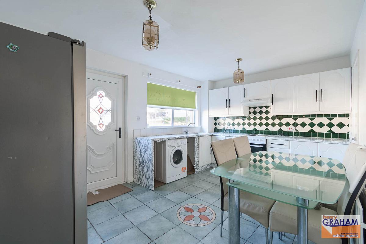 Range of high and low level units. Granite effect round edge work surfaces. Space for oven and hob. Extractor unit. Single drainer stainless steel sink unit with mixer tap. Plumbed for washing machine. Storage under stairs. Part tiled walls. Tiled floor. PVC double glazed door to rear patio garden.