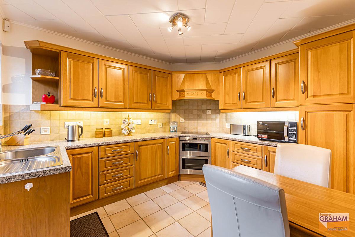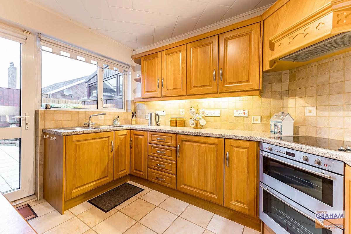 Measurements taken to widest points. Range of high and low level units. Granite effect round edge work surfaces. Integrated double oven. Integrated Neff hob. Integrated fridge. Extractor unit. Single drainer stainless steel. Blanco sink unit with mixer tap. Part tiled walls. Tiled floor. PVC double glazed door to rear patio garden.