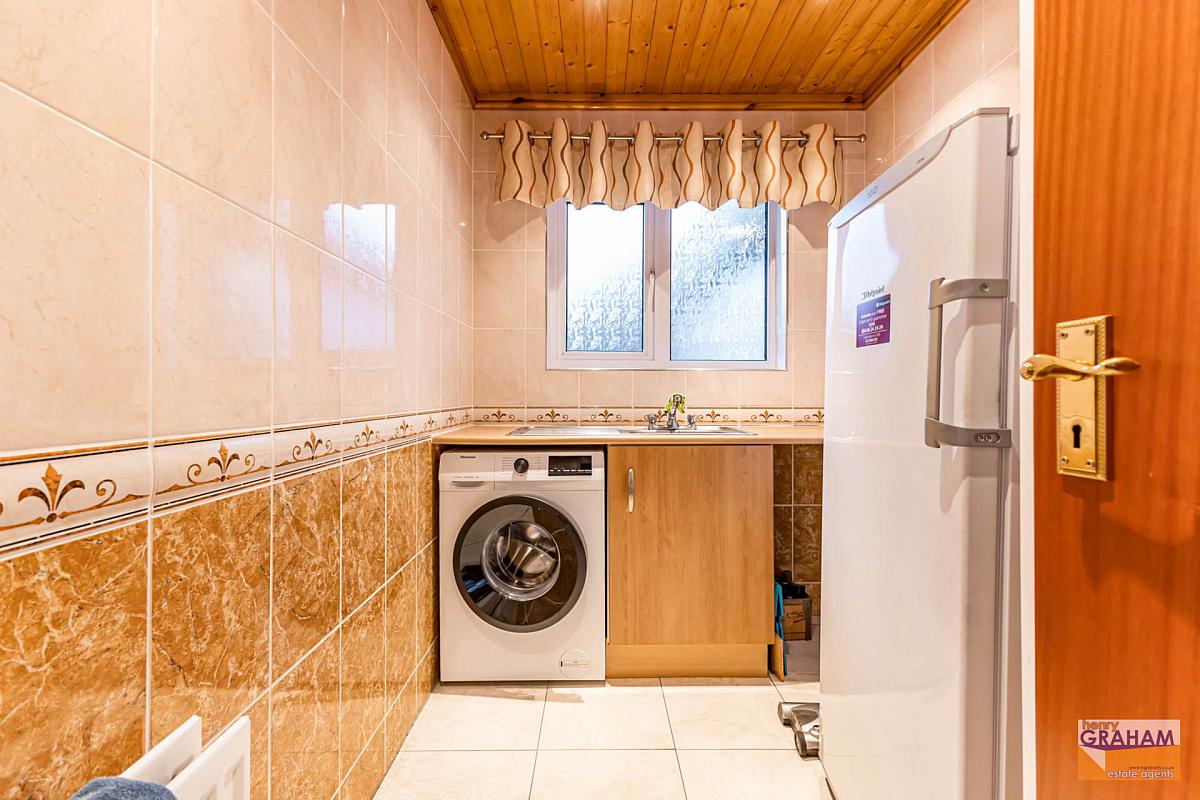 Measurements taken to widest points. Low level unit. Woodgrain effect round edge work surface. Single drainer stainless steel sink unit with mixer tap. Plumbed for washing machine. Space for tumble dryer. Tiled walls. Tiled floor. Recessed spotlights.