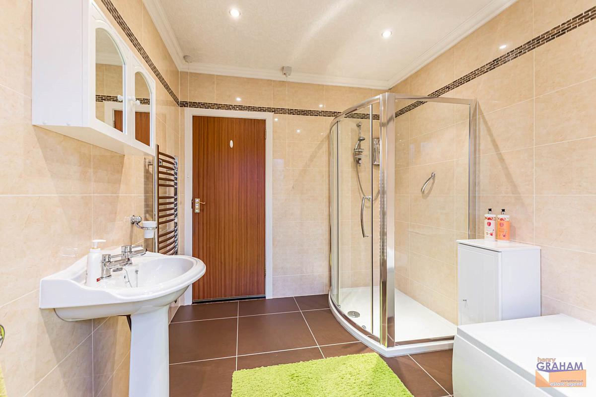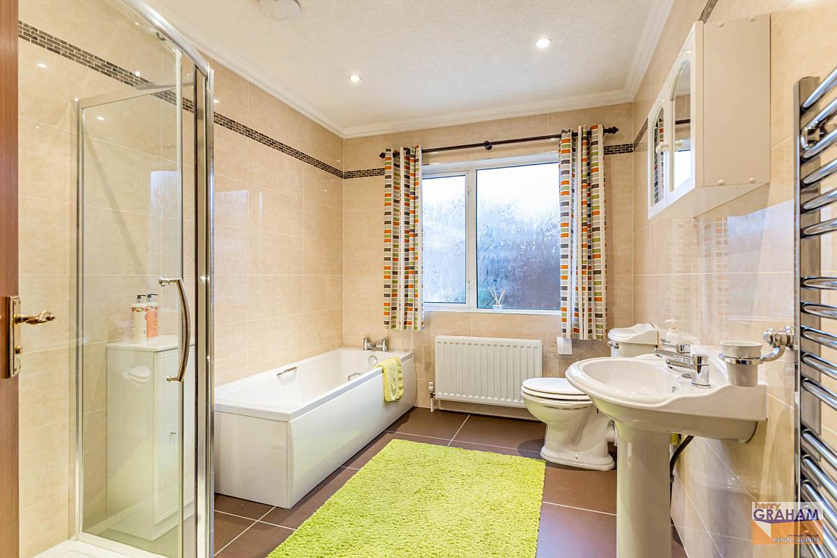 White suite. Large shower cubicle with Triton electric shower. Panelled bath with mixer tap. Pedestal wash hand basin. Close couple low flush wc. Chrome finish heated towel rail. Tiled walls. Tiled floor. Recessed spotlights.
