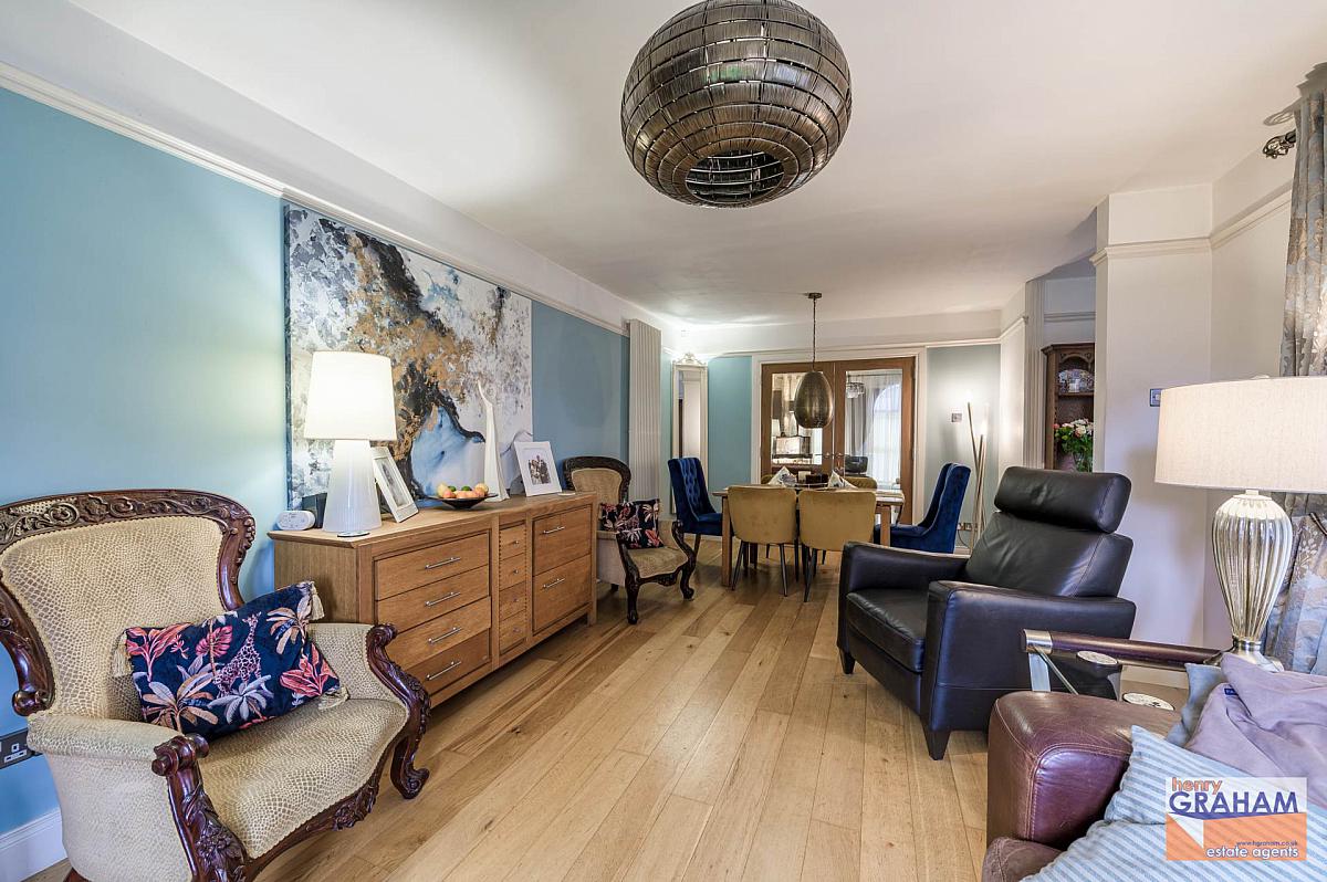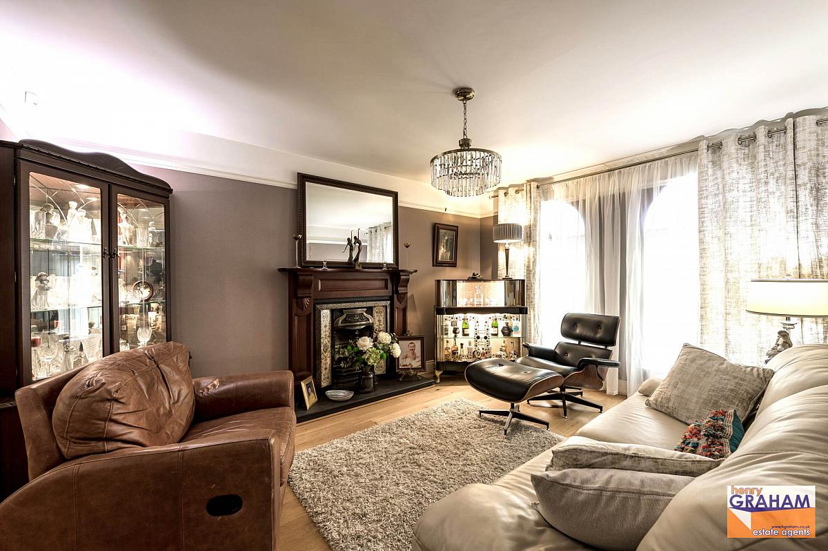 Mahogany and tiled fireplace with coal effect gas fire. Laminated timber floor. Double glazed double doors through to dining area.