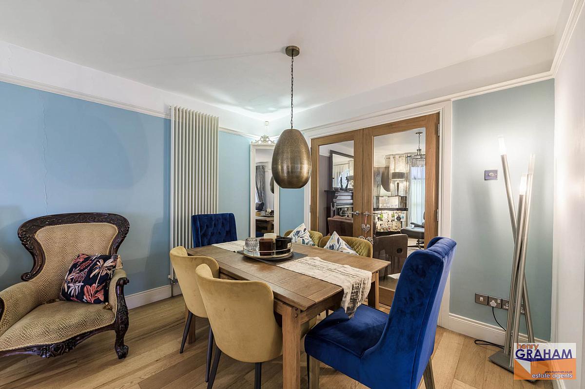 Brick built fireplace with large coal effect gas stove. Laminated timber floor. Open plan to dining area. PVC double glazed double doors to rear garden and patio area.
