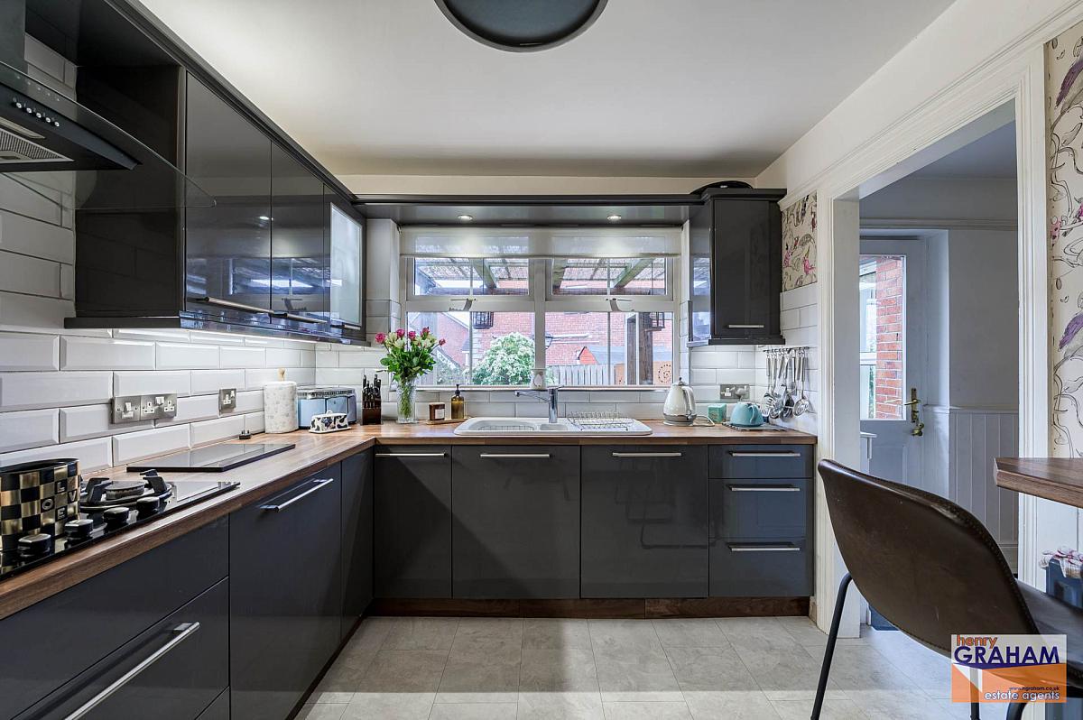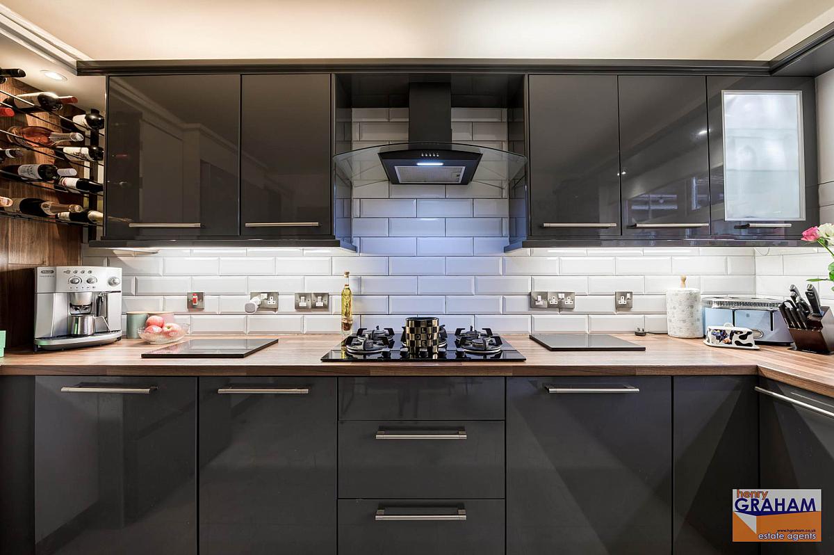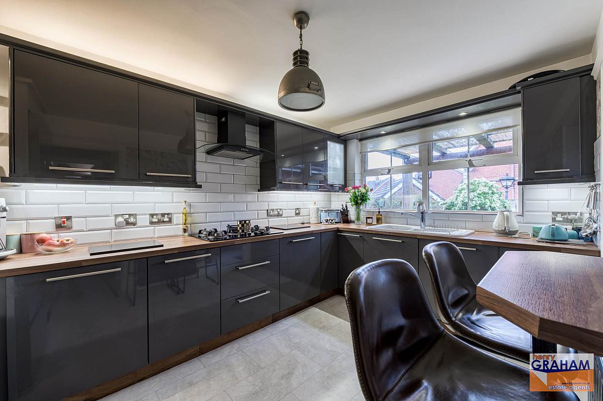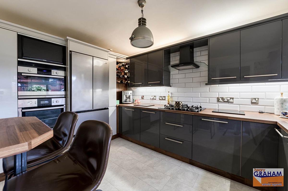 Range of high and low level units. Wood grain effect round edge work surfaces. Integrated Samsung oven. Integrated Samsung microwave. Integrated Premier range five ring gas hob. Integrated Samsung television. Extractor unit in black stainless steel canopy. Fridge freezer. Bowl and a half single drainer ceramic sink unit with mono style mixer tap. Under unit lighting. Part tiled walls. Laminated timber floor. Open plan to rear hall.