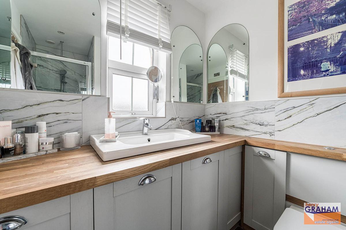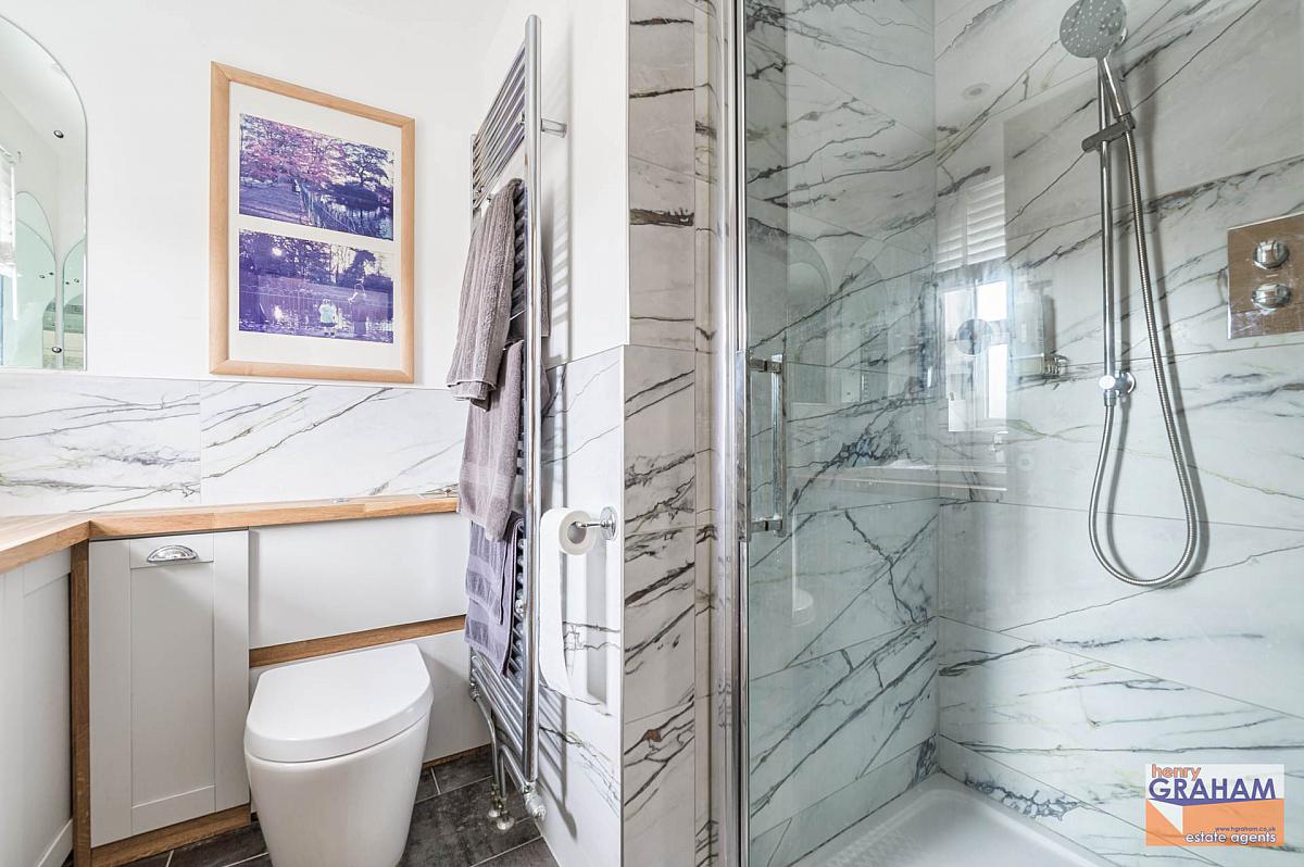Large shower cubicle with thermostatic shower and drencher head. Large vanity unit with oak work top and large wash hand basin with mono style mixer tap. Concealed low flush wc. Chrome finish heated towel rail. Part tiled walls. Tiled floor. Recessed spotlights.