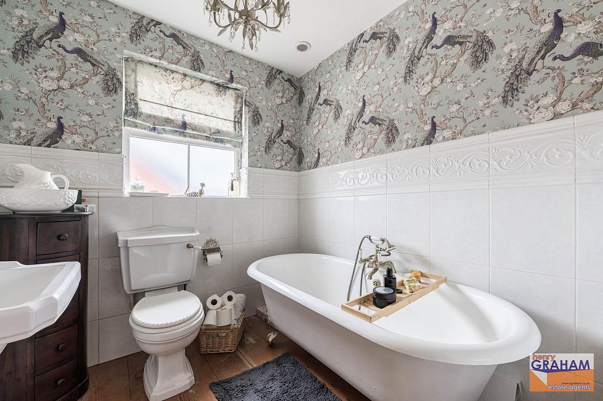 White suite. Freestanding bath tub with centre mount mixer tap and shower attachment. Pedestal wash hand basin. Close couple low flush wc. Part tiled walls. Solid wood floor. Separate large storage cupboard on landing.