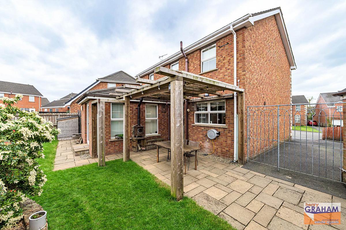 Front garden laid in lawn with tarmac driveway and parking area. Enclosed rear garden laid in lawn with covered paved patio area. Raised flower beds with shrubbery. Paved path to side. Large garden shed. Outside tap and light. Enclosed area for bin storage. Large storage bin.