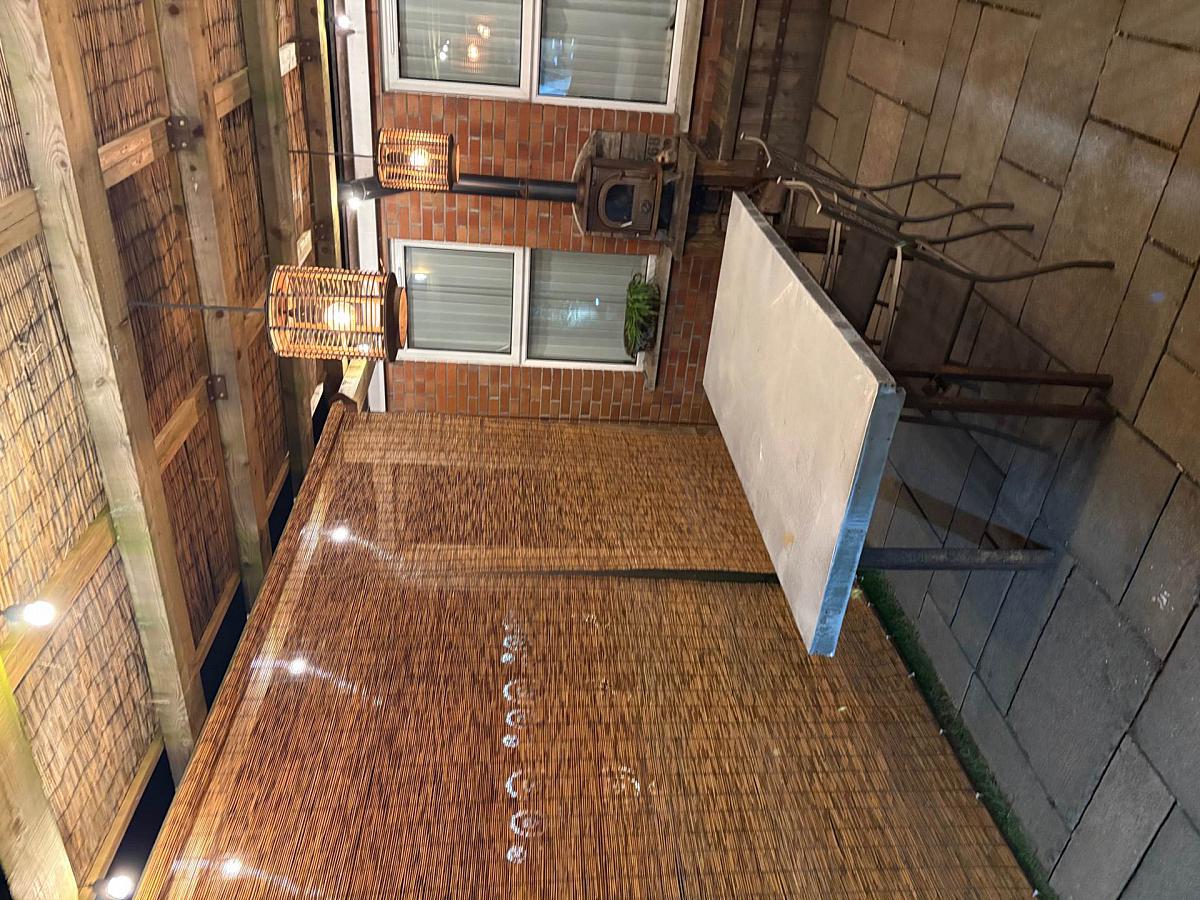 Laminated timber floor. Recessed spotlights.