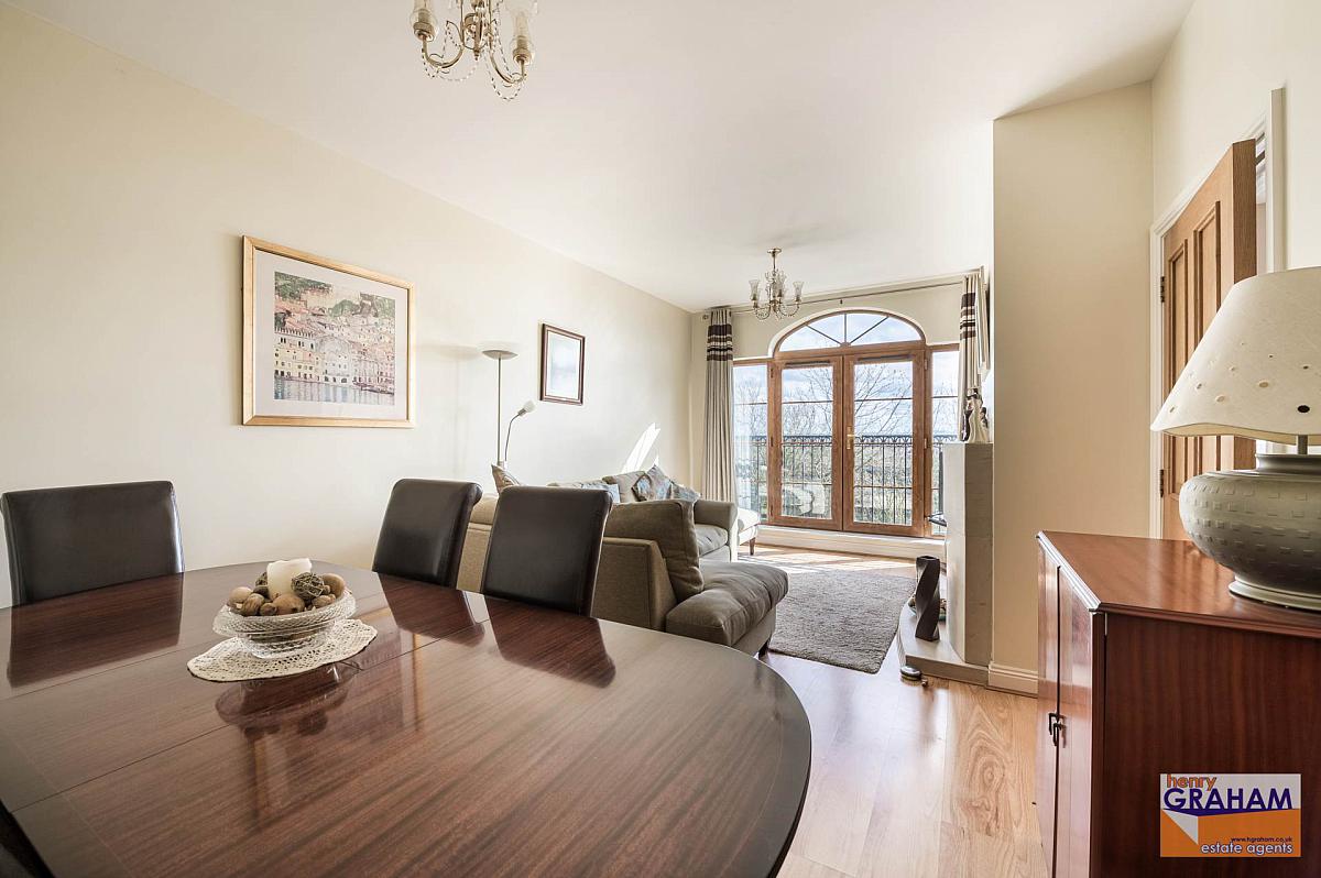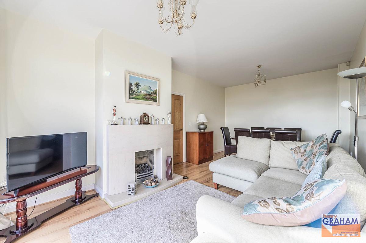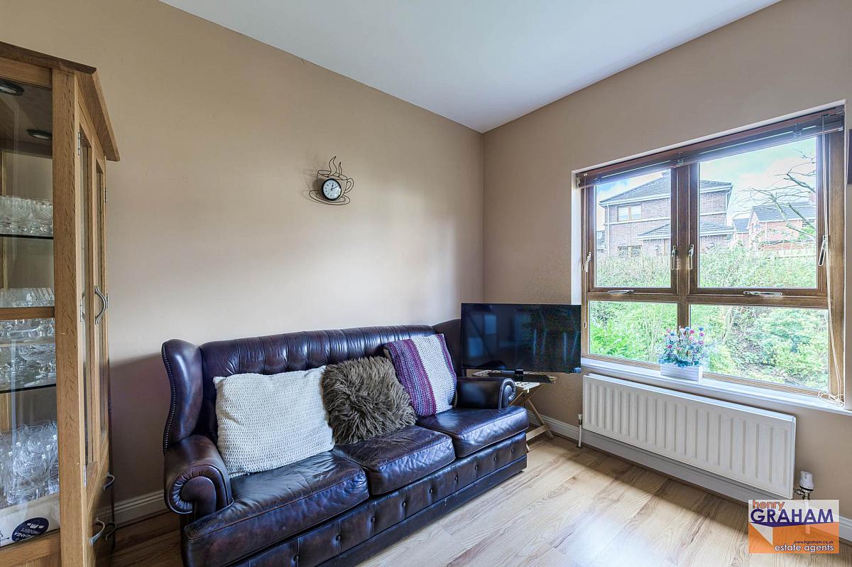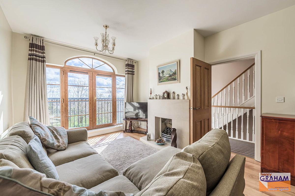 Limestone fireplace and hearth. Gas fire. Laminated timber floor. Golden oak PVC double glazed balconette doors with panoramic views over Lisburn to include Slieve Croob and Mourne Mountains.