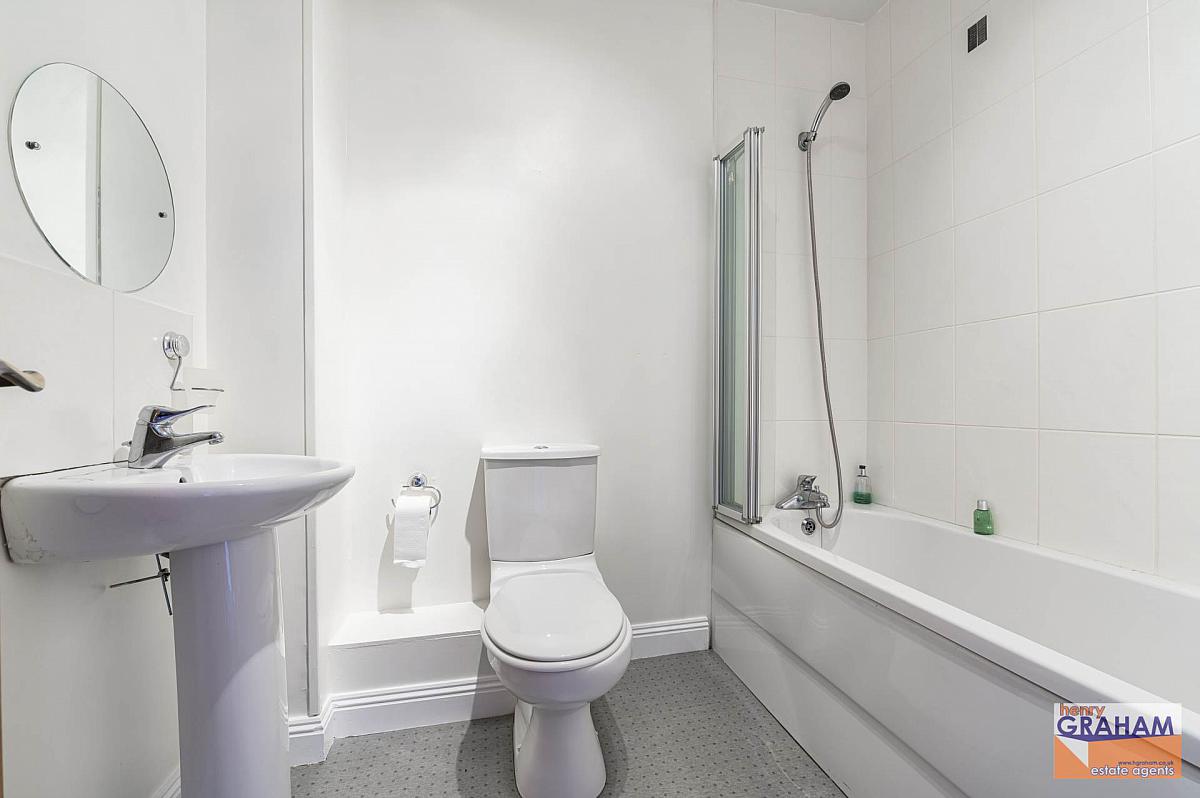 White suite panelled bath. Mixer tap. Shower attachment. Shower screen. Tiled surround. Pedestal wash hand basin. Mono style mixer tap. Tiled splashback. Close couple low flush WC.