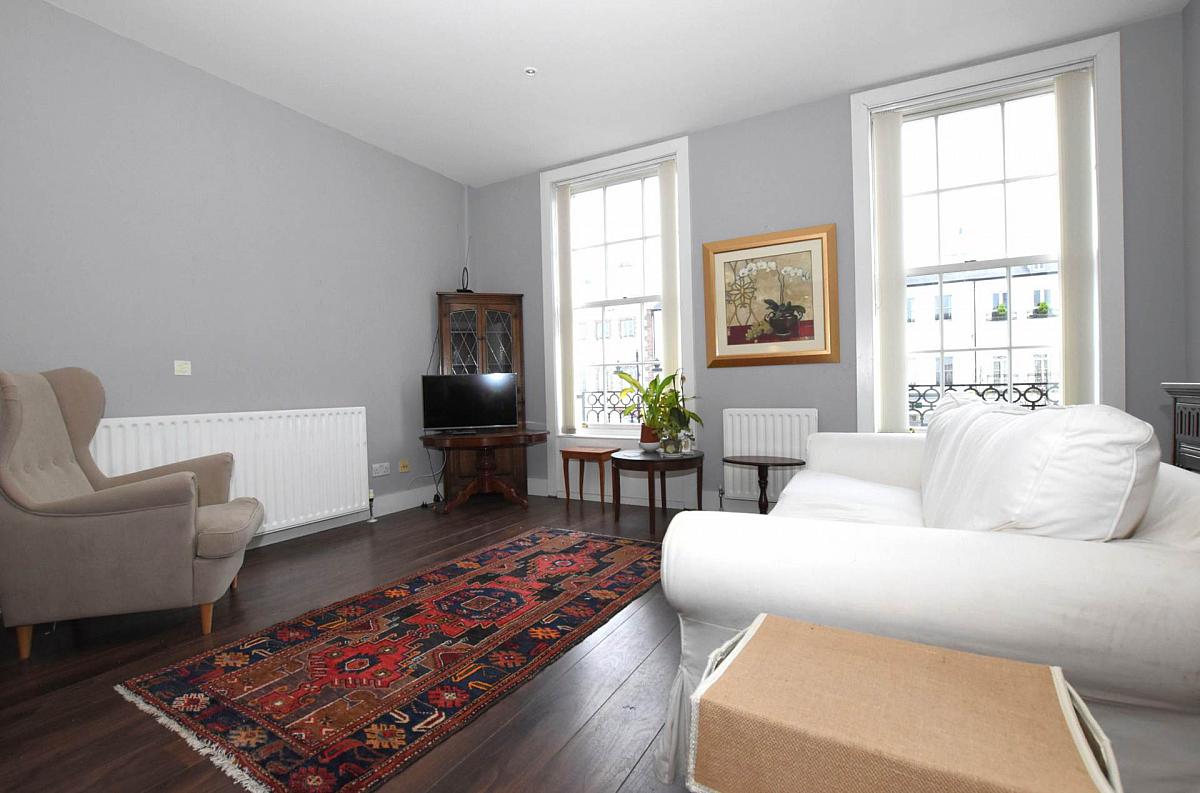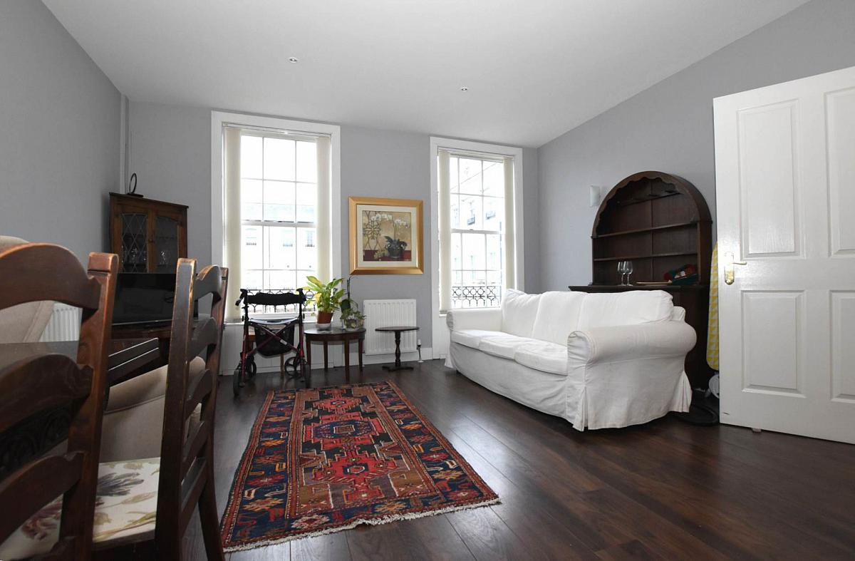 Spacious Lounge And Dining Area With Laminated Timber Floor And Two Large Windows Overlooking The Square