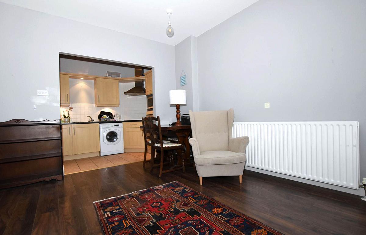 Laminated timber floor. Recessed spotlights, Open plan to kitchen.