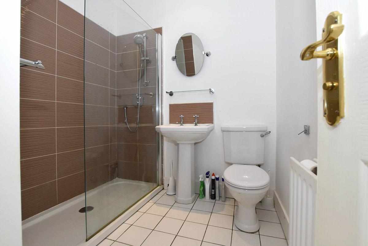 Large walk in shower cubicle. Thermostatic shower. Pedestal wash hand basin. Close couple low flush wc. Tiled floor. Recessed Spotlights.