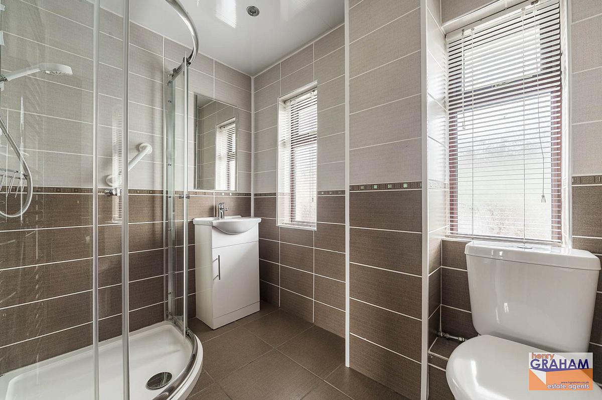 Quadrant shower cubicle with Mira Sport electric shower. Vanity unit with wash hand basin and mono style mixer tap. Close couple low flush wc. Chrome finish heated towel rail. Tiled walls. Tiled floor. Recessed spotlights.