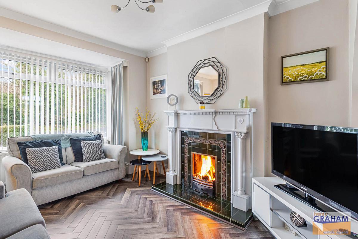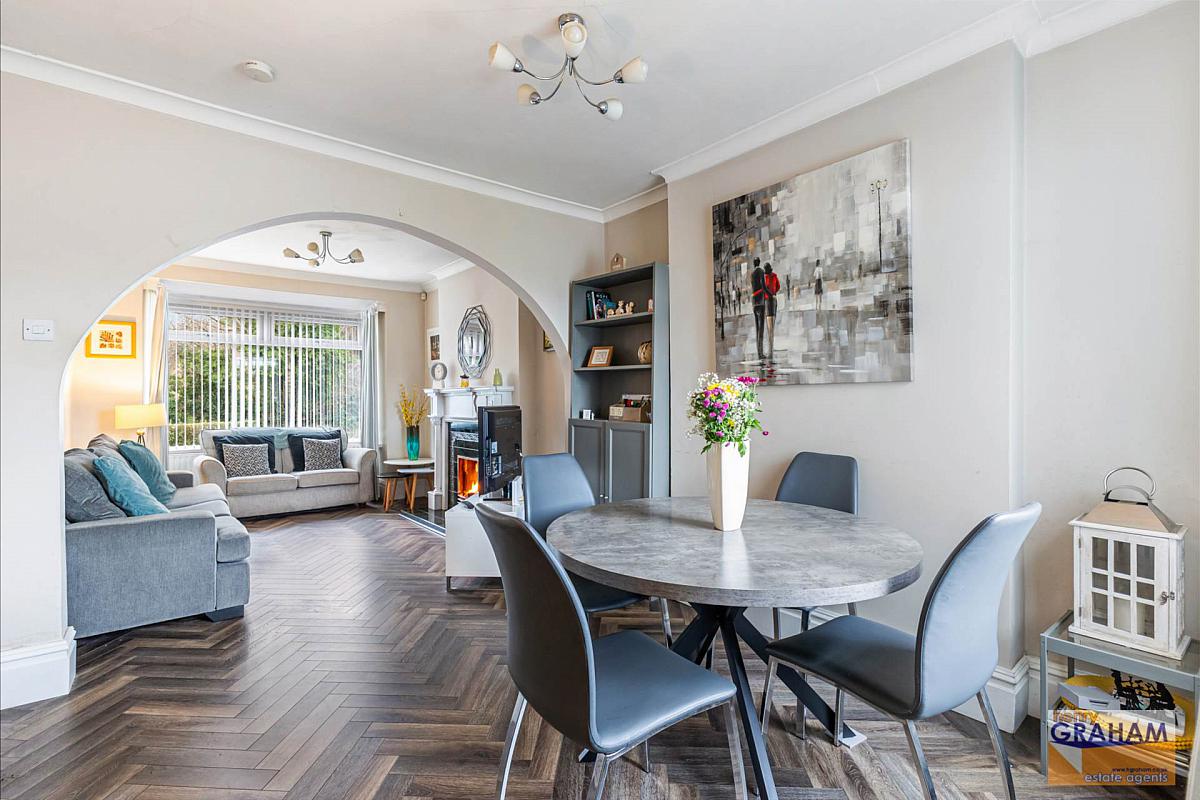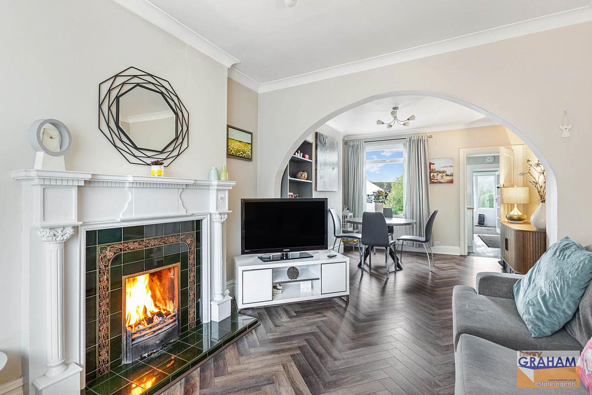 Measurements taken into bay window. Decorative wooden and tiled fireplace with open fire. Herringbone style laminated timber floor. Open plan to dining area.