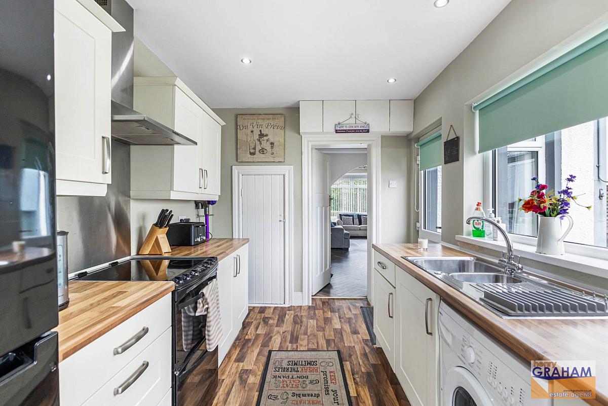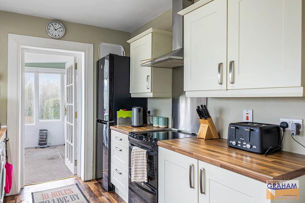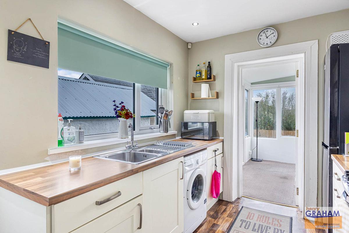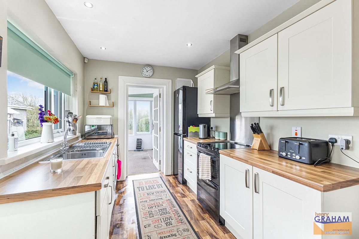 Range of high and low level units. Wood strip effect round edge work surfaces. Space for oven and hob. Extractor unit in stainless steel canopy. Space for fridge freezer. Bowl and a half single drainer stainless steel sink unit with mixer tap. Plumbed for washing machine. Storage under stairs. PVC double glazed door to rear patio area and garden. Recessed spotlights.