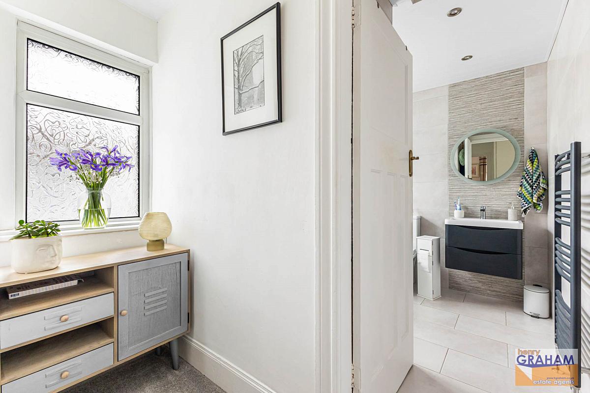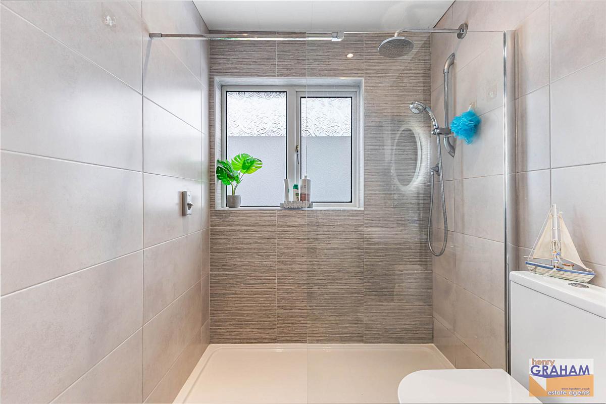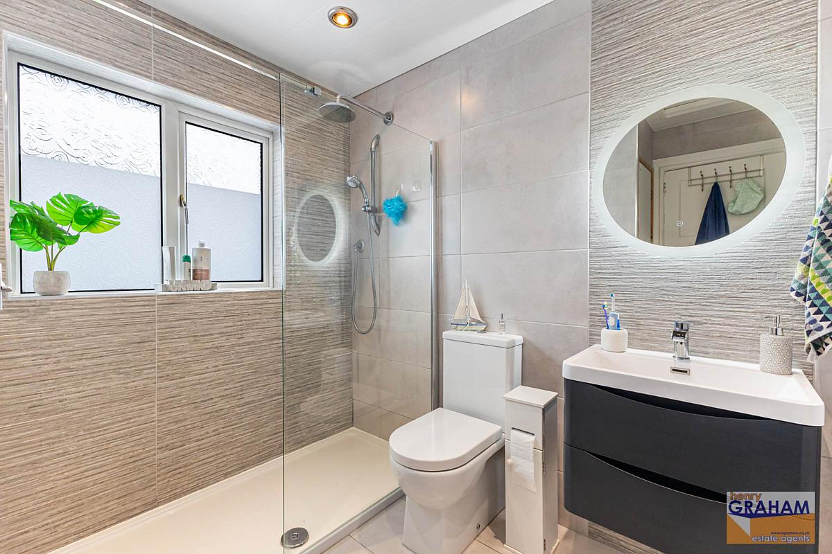 Shower enclosure with thermostatic shower and drencher head. Wall mounted vanity unit with wash hand basin and waterfall style mono style mixer tap. Close couple low flush wc. Heated towel rail. Hotpress. Tiled walls. Tiled floor. Recessed spotlights. Separate storage cupboard on landing.