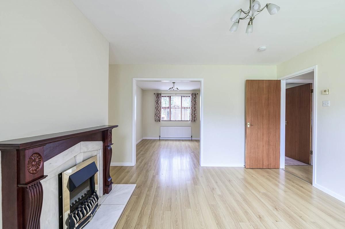 Mahogany and granite fireplace with coal effect electric fire. Laminated timber floor. Open plan to dining area.