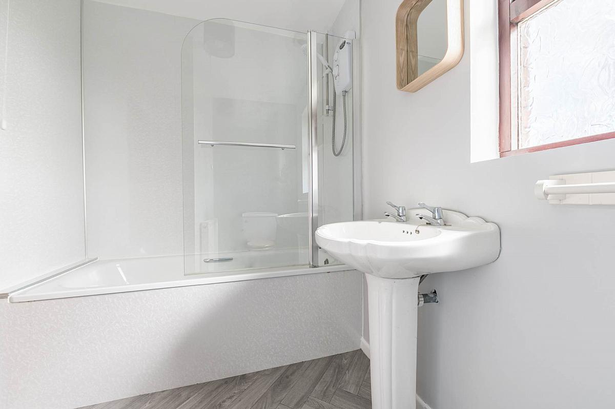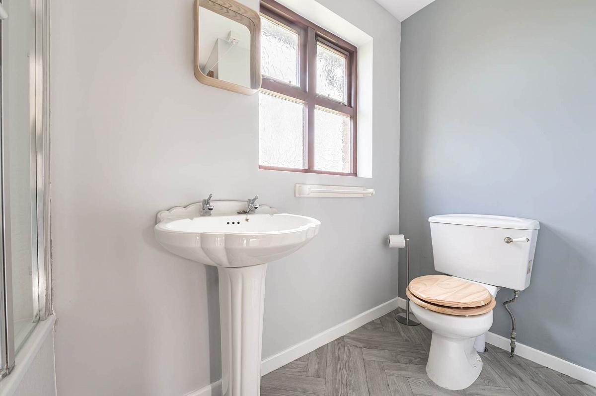 White suite. PVC panelled bath with Mira Sprint electric shower. Pedestal wash hand basin. Close couple low flush wc. Part PVC panelled walls. Separate hotpress on landing.