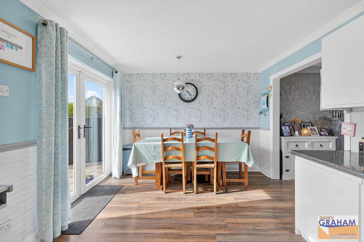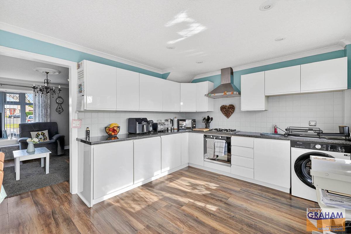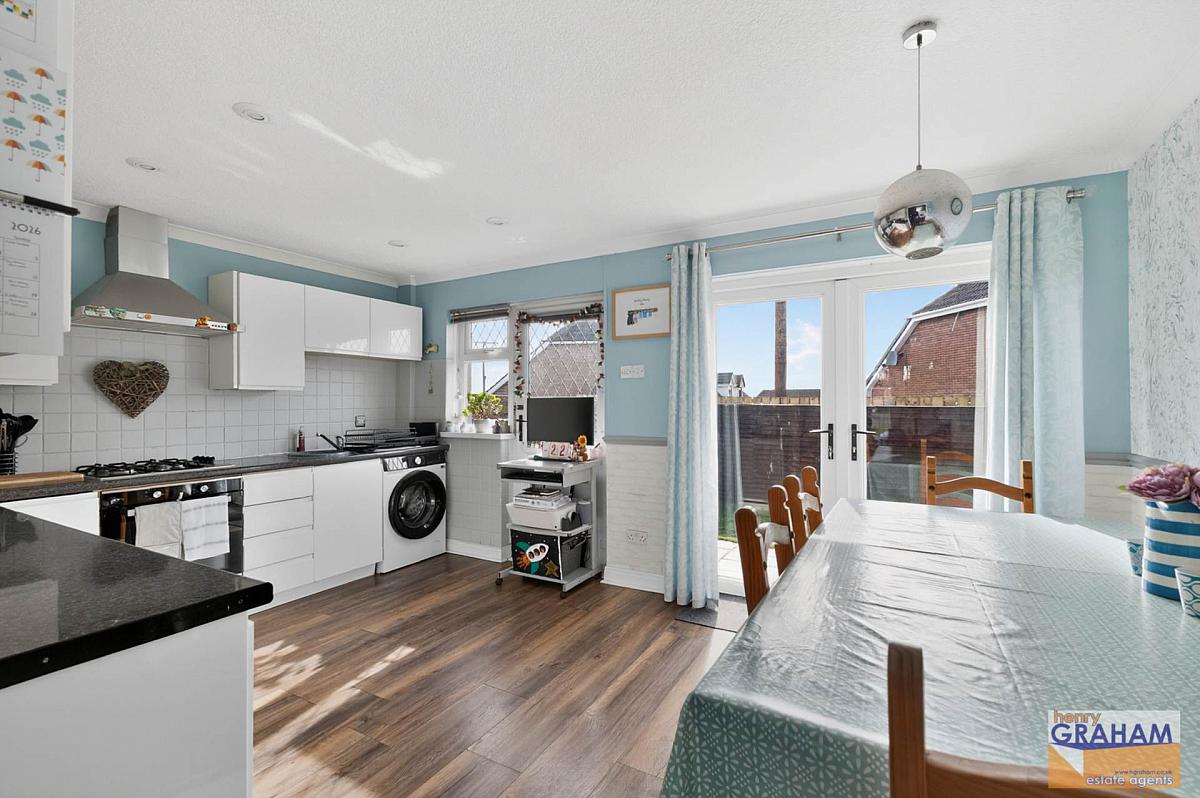 Range of high and low level units. Polished granite effect round edge work surfaces. Integrated oven. Integrated gas hob. Integrated fridge. Integrated freezer. Extractor unit in stainless steel canopy. Circular stainless steel sink unit with drainer and mono style mixer tap. Plumbed for washing machine. Part tiled walls. Laminated timber floor. Open plan to lounge. PVC double glazed door to rear patio area and garden. PVC double glazed double doors to rear patio area and garden.