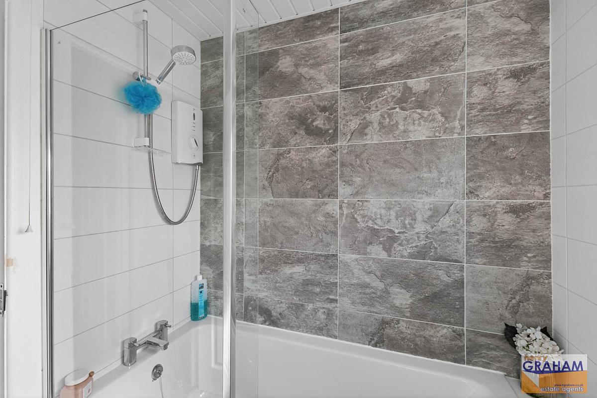 White suite. Panelled shower bath with mixer tap and Mira Sport electric shower. Pedestal wash hand basin with mono style mixer tap. Close couple low flush wc. Tiled walls. Tiled floor. Recessed spotlights. Separate hotpress on landing.