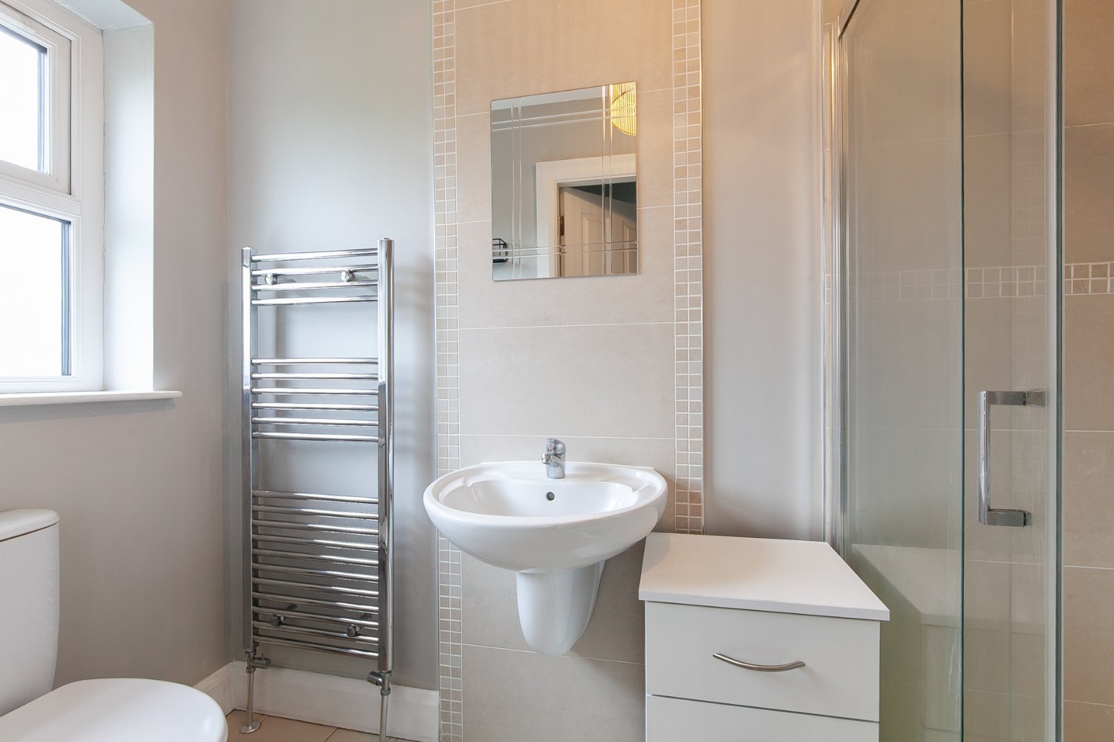 Modern shower room suite with feature tiling