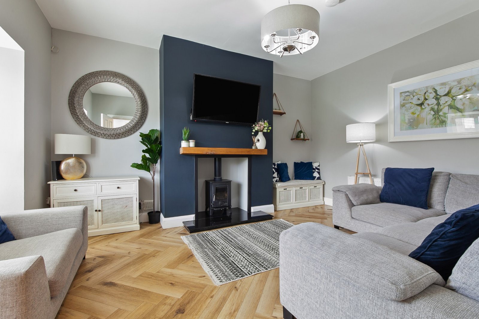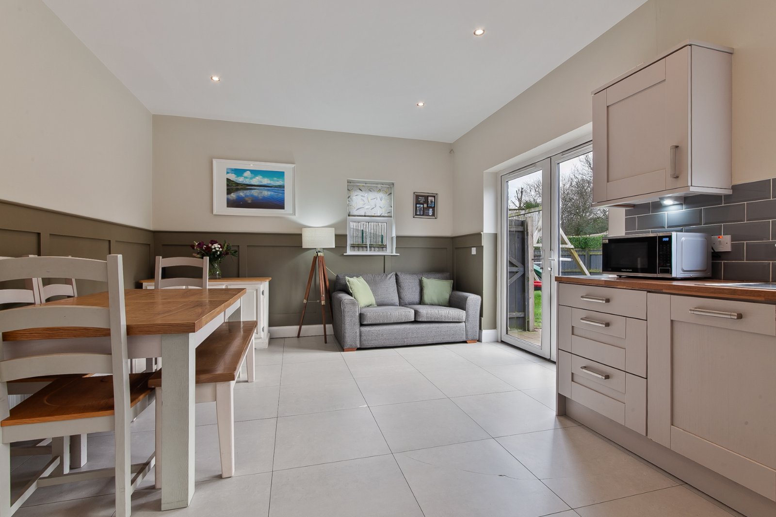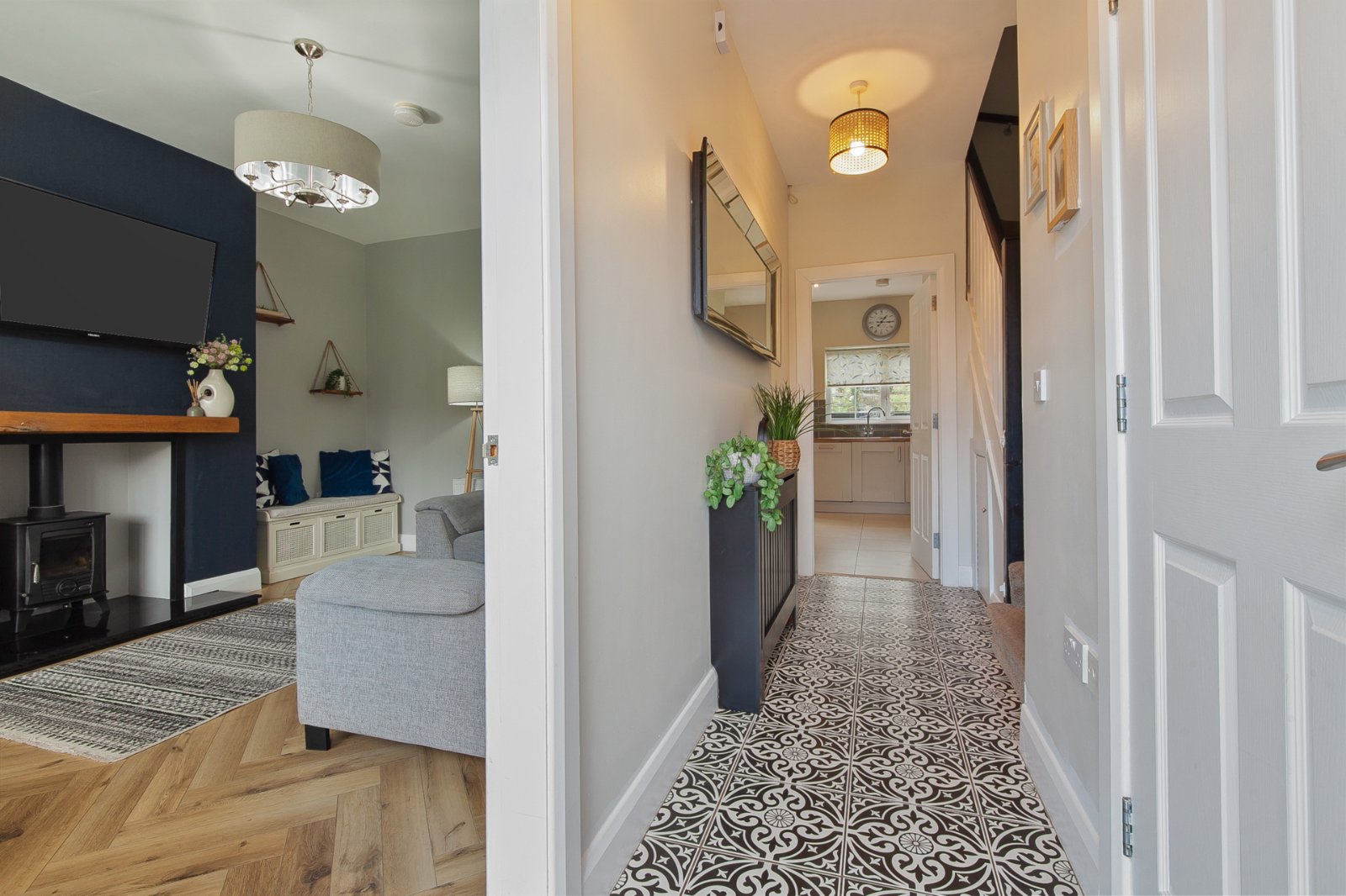 Modern fitted kitchen with excellent range of units and integrated appliances. Utility cupboard affording excellent storage. Feature tiling and patio door to rear.